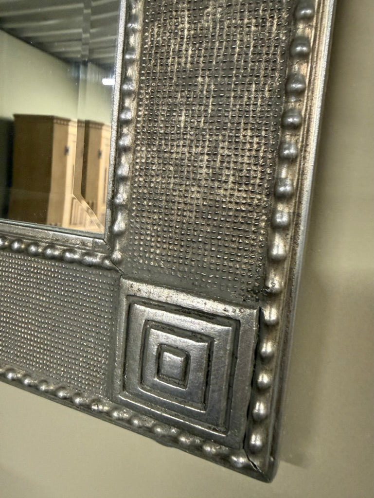 A striking silver-framed mirror featuring elegant geometric detailing at each corner. The frame is in excellent structural condition and makes a refined addition to any room without overwhelming the space. Perfect for those seeking understated sophistication with visual interest.