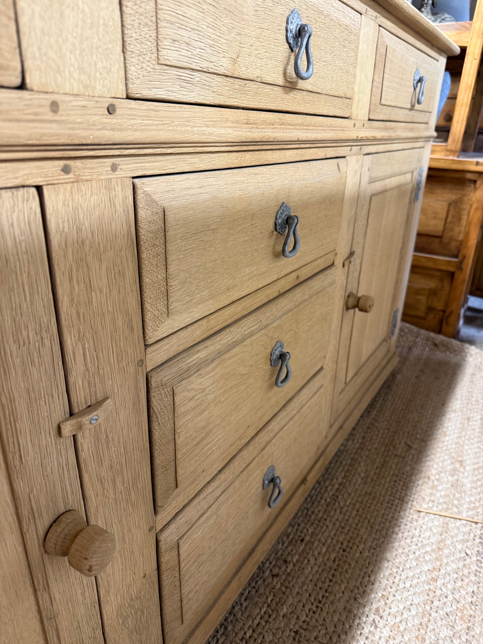 • Load image into Gallery viewer, Crafted from solid oak and restored to its authentic natural finish, this exceptional sideboard combines timeless elegance with practical functionality. The robust construction features six dovetail-jointed drawers and two spacious cupboards, each fitted with an internal shelf, delivering generous storage solutions for any room. Its substantial weight reflects the quality craftsmanship and durability. A protective wax finish will enhance both its appearance and longevity.