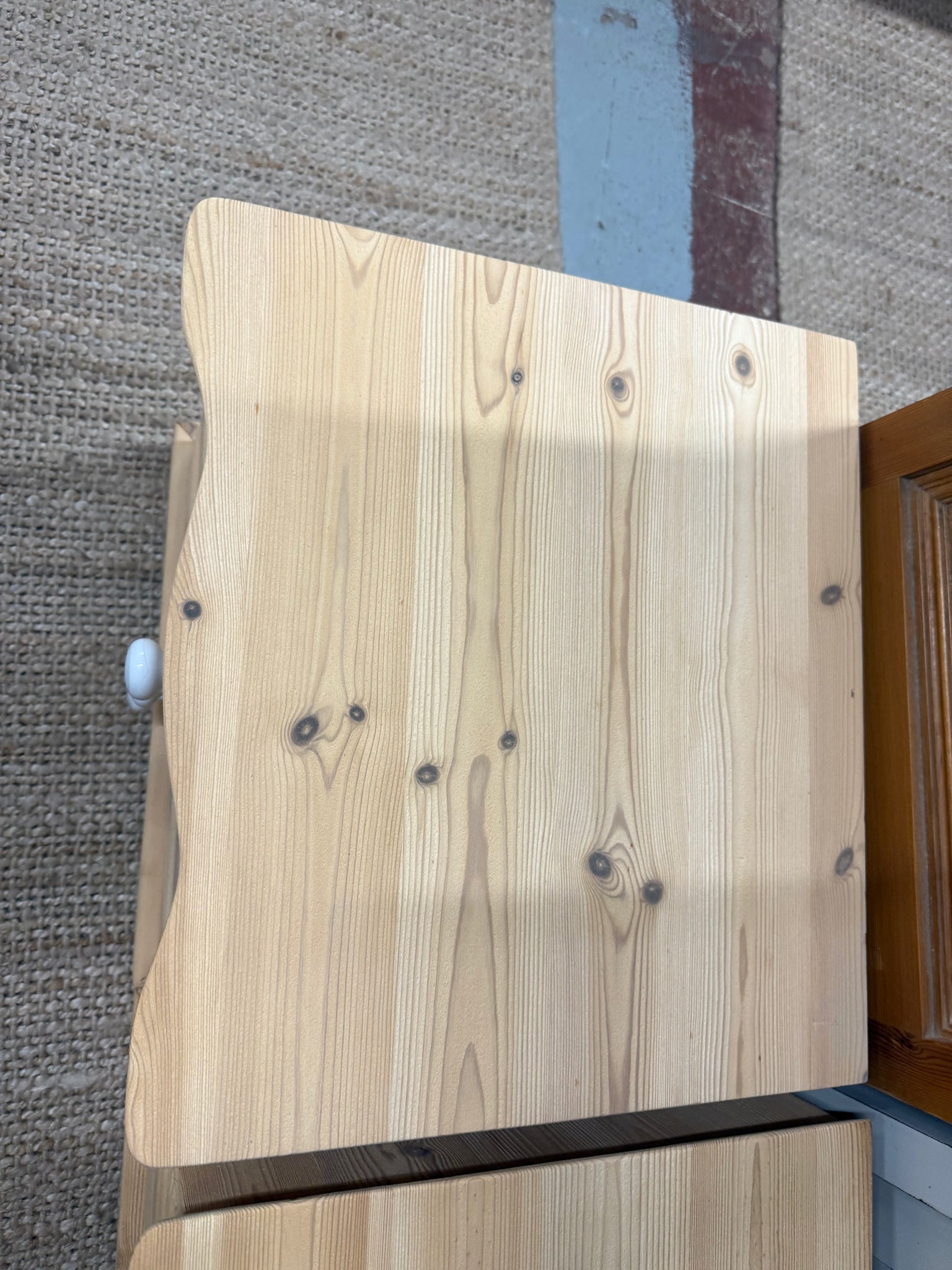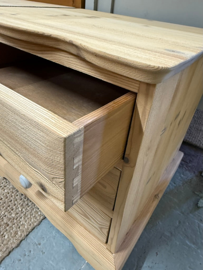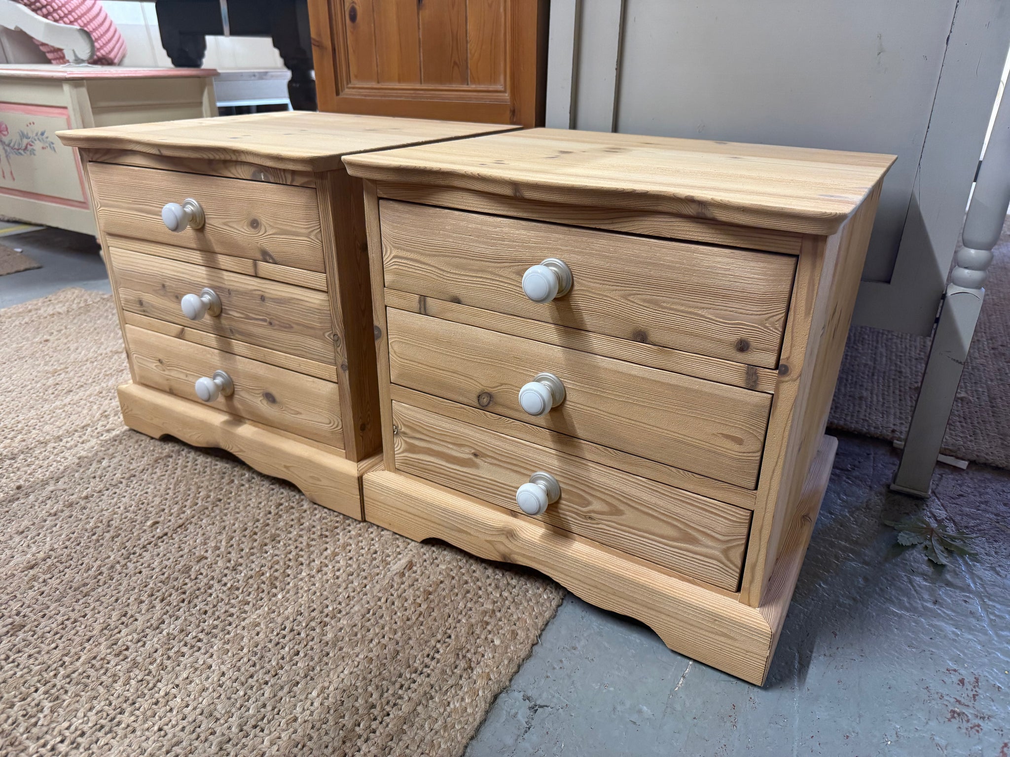 This charming pair of solid pine bedside tables have been fully stripped to reveal the natural wood, perfect for adding a protective wax finish if desired. Each bedside features three drawers with dovetail joints, offering ample storage with style.