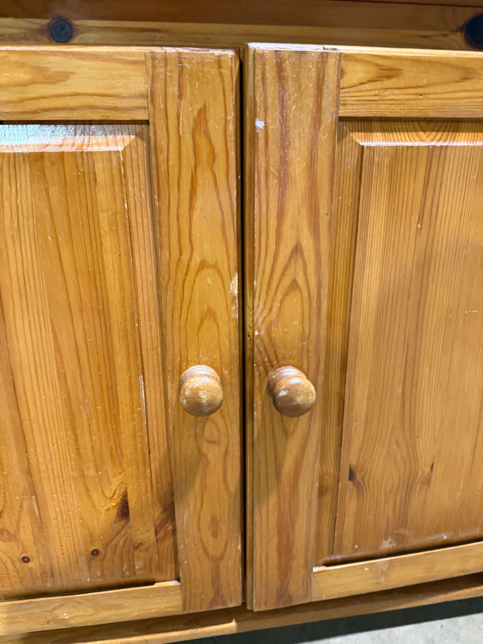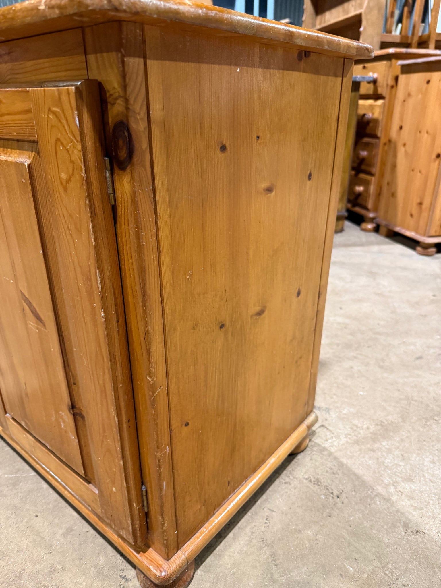 A sturdy low pine cupboard built from solid pine that's ready for use or restoration. The surface shows honest wear and patina, presenting an opportunity to refinish through sanding or painting to suit your taste. One internal shelf provides practical storage space.
