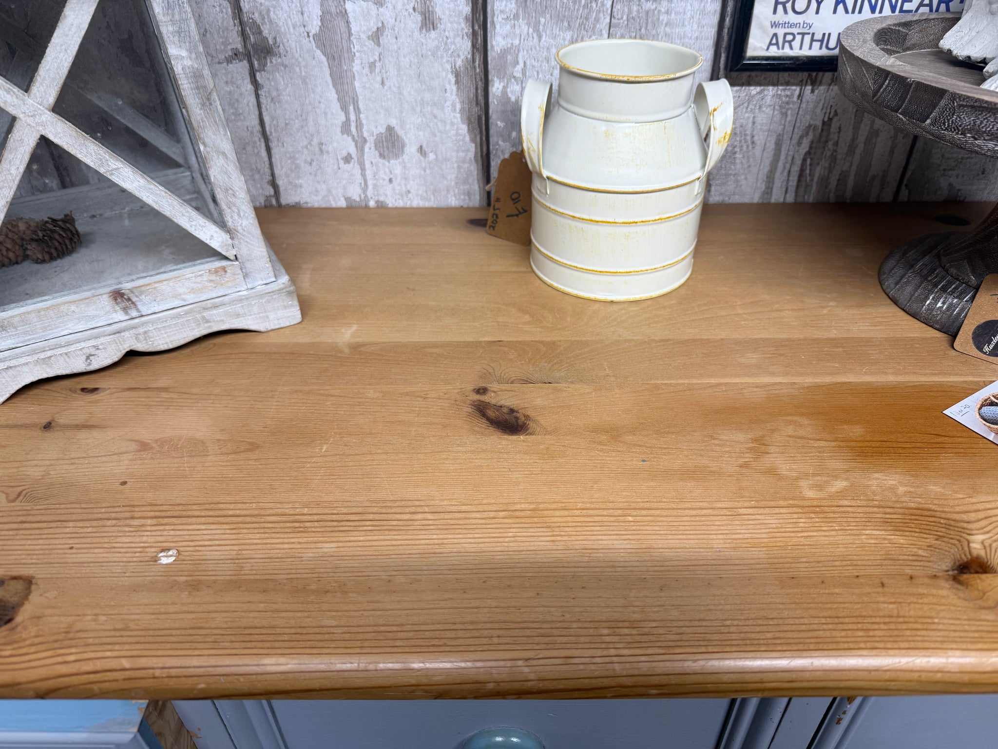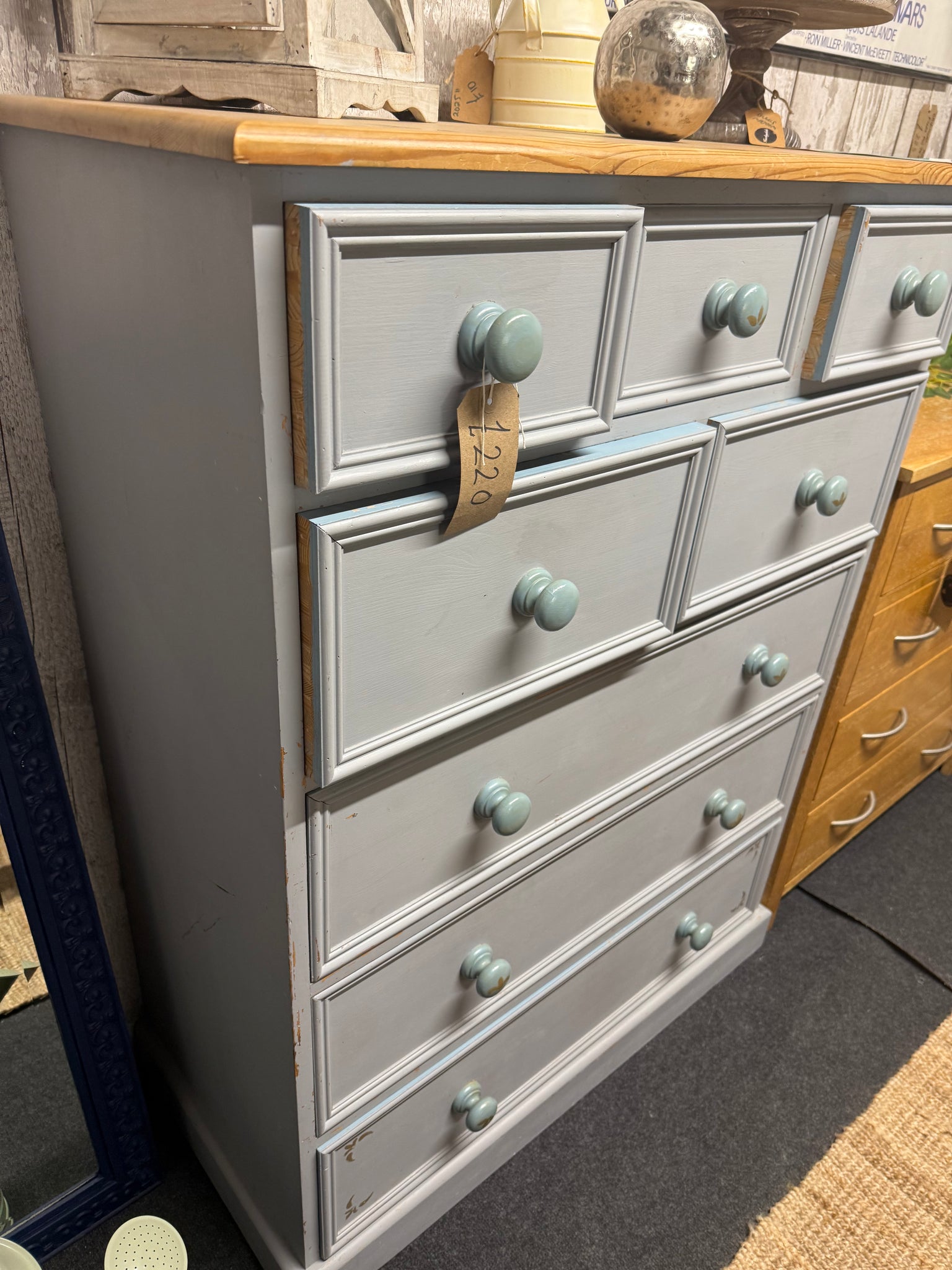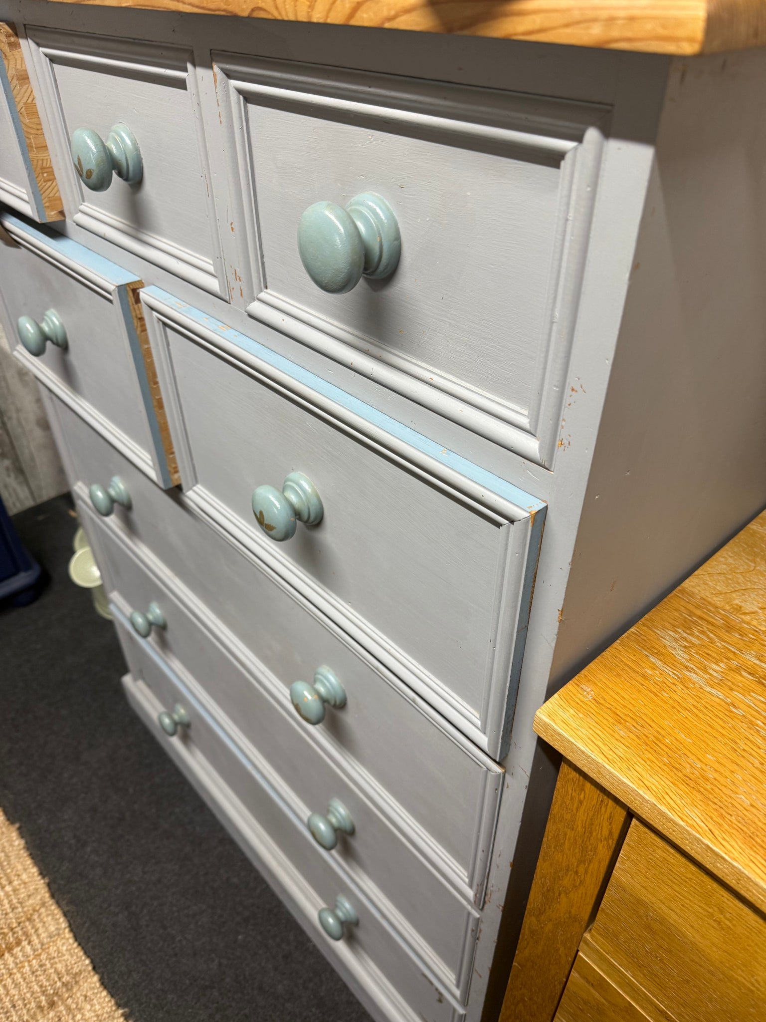 Solid pine chest of drawers with eight dovetail-jointed compartments across three short, two medium, and three long. The piece carries a grey paint layer from its previous owners and requires some practical work—several drawers need some attention to operate smoothly, whilst the entire surface would benefit from a repaint unless you like the distressed look this is perfect for buyers seeking an honest, workable piece with genuine pine construction and restoration potential.