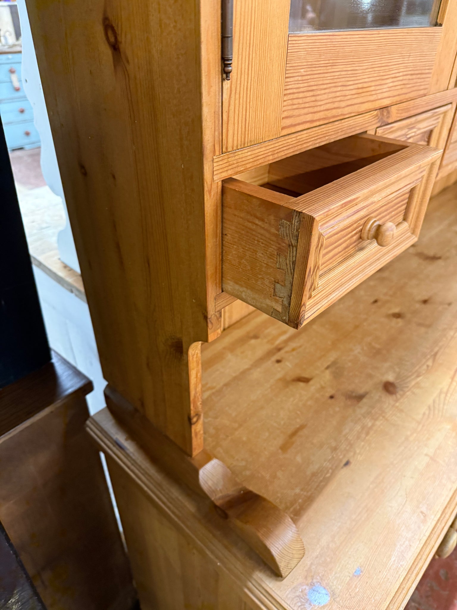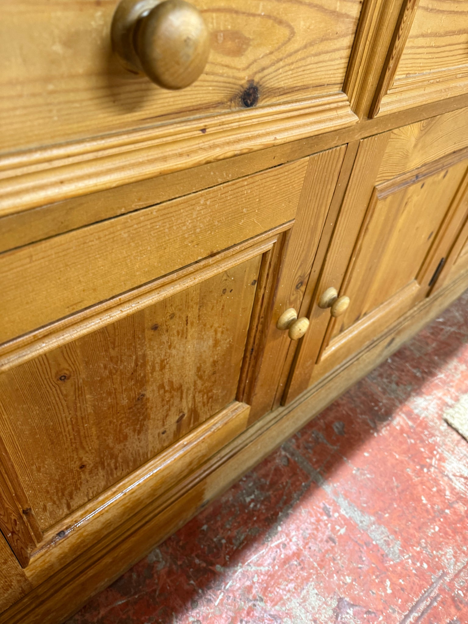 Built from solid pine with sturdy dovetail joinery throughout, this dresser delivers substantial storage capacity. The top section includes six drawers, two cupboards, and two shelves, while the base features three more drawers plus a double and single cupboard. In good working order with the honest wear you'd expect from a piece with history, it's free from major damage. Designed to separate into two parts for convenient handling and placement in your home.