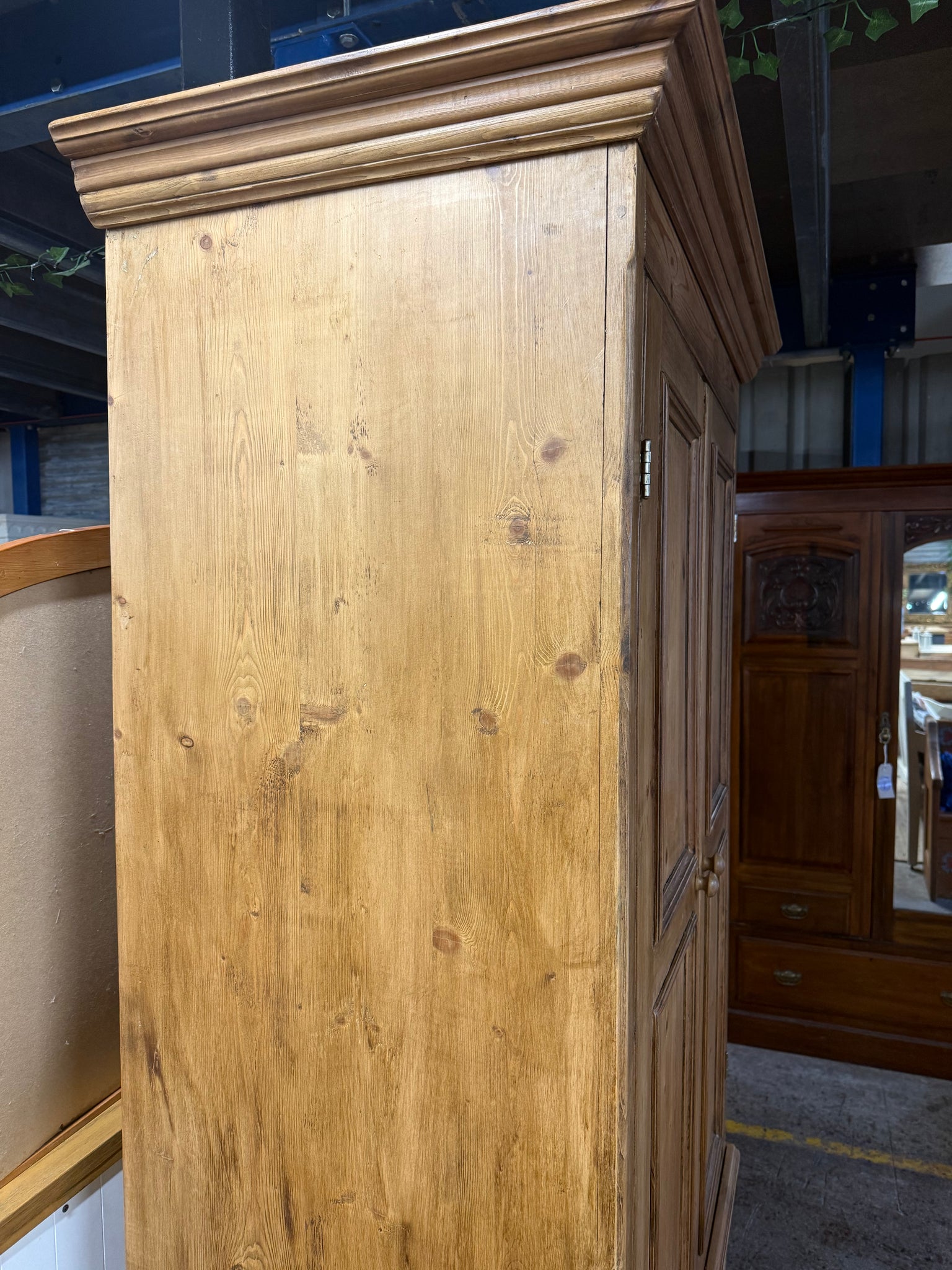 A versatile solid pine storage piece that works as a larder, linen press, or wardrobe with the addition of a hanging rail. Structurally sound and well-maintained, this cabinet features two internal shelves and a single dovetail-jointed drawer for organised storage. The finish shows minor cosmetic marks consistent with age, but nothing that detracts from its functionality or appeal. Disassembles into three sections for convenient transport and storage.