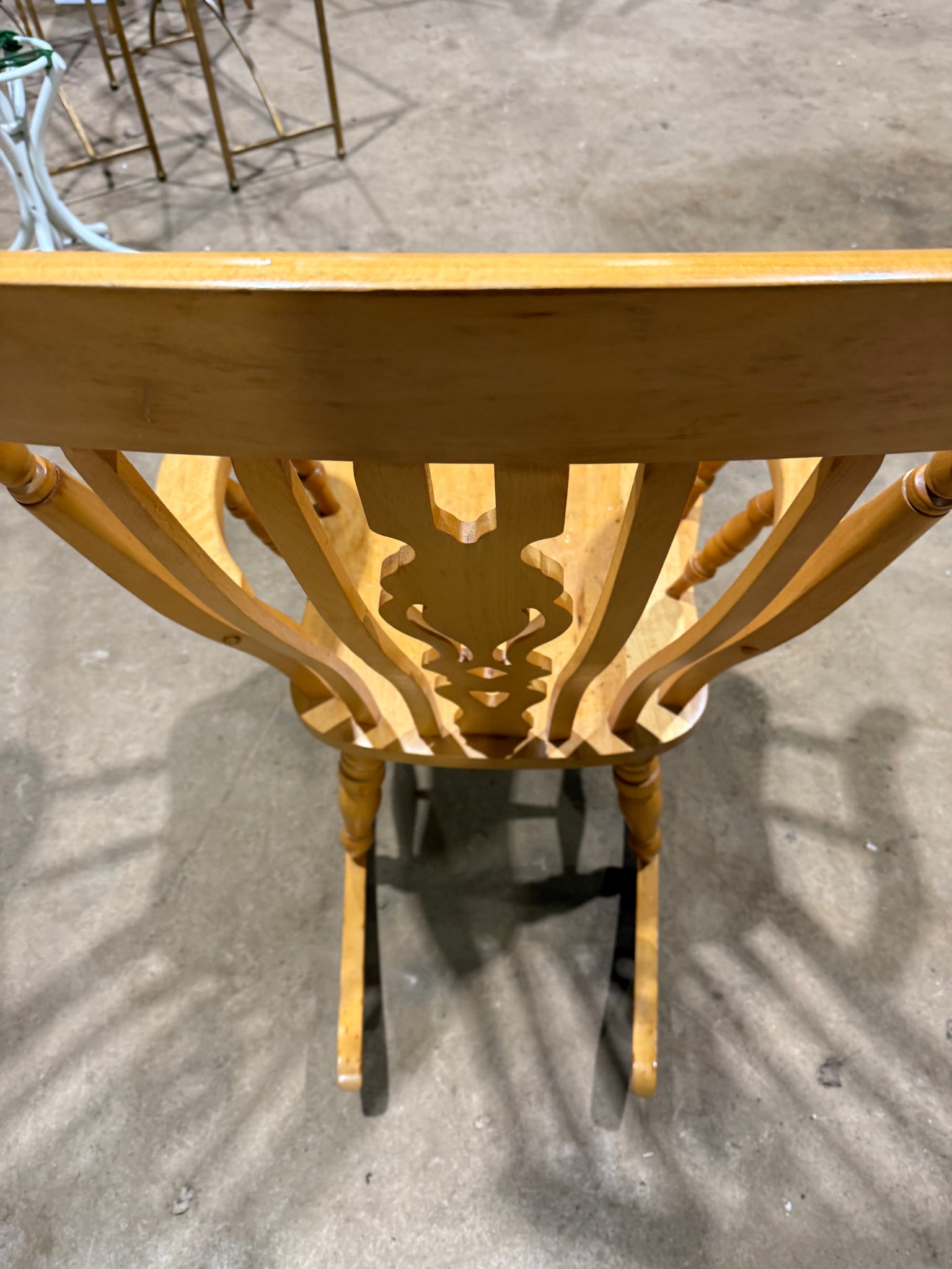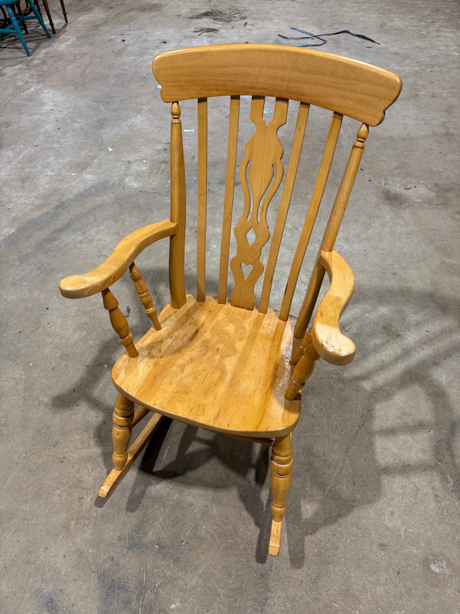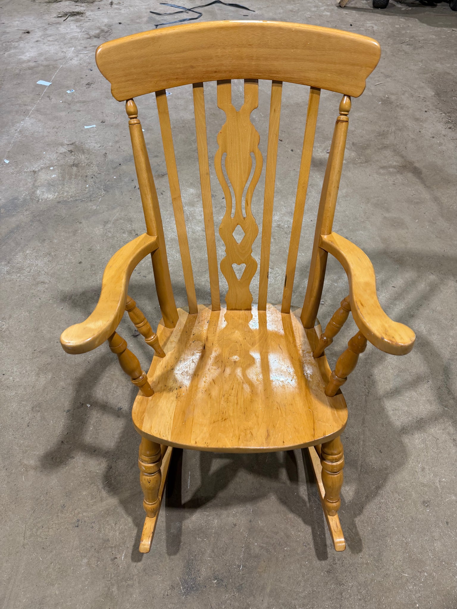 A charming solid pine rocking chair with authentic farmhouse character. Built from sturdy pine, this gently used piece shows its age with minor surface marks that add to its rustic appeal. Structurally sound and ready for use, it's ideal for creating a relaxing corner retreat or adding vintage warmth to any room.