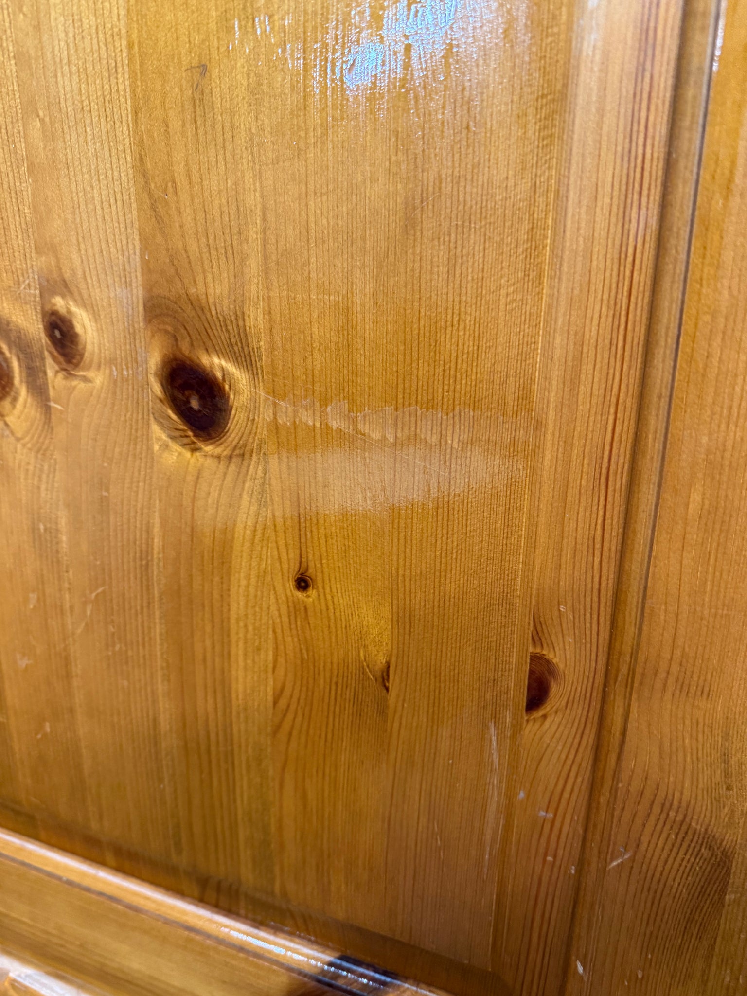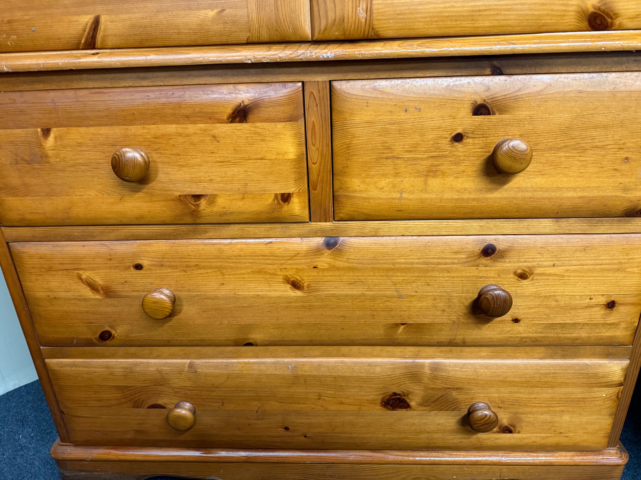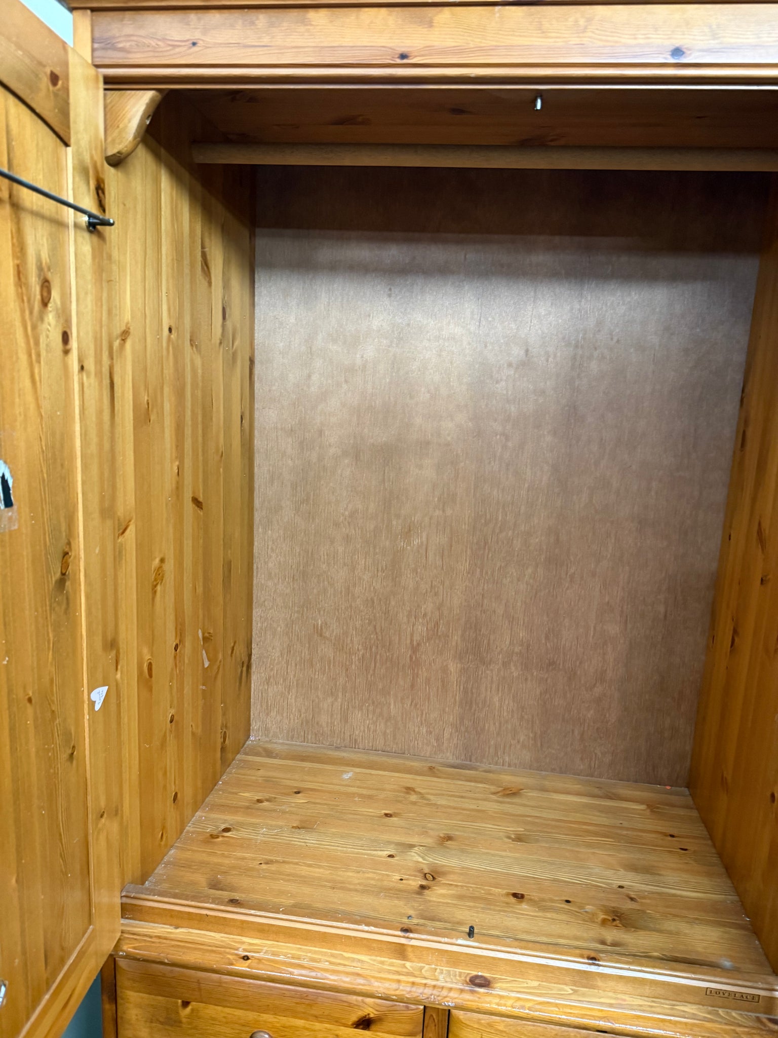 Built from solid pine with genuine structural integrity, this wardrobe delivers substantial storage capacity through one hanging rail and four dovetail-jointed drawers—two compact and two full-length. The piece shows honest wear with surface marks and paint marks. Splits into two sections for practical handling and installation.