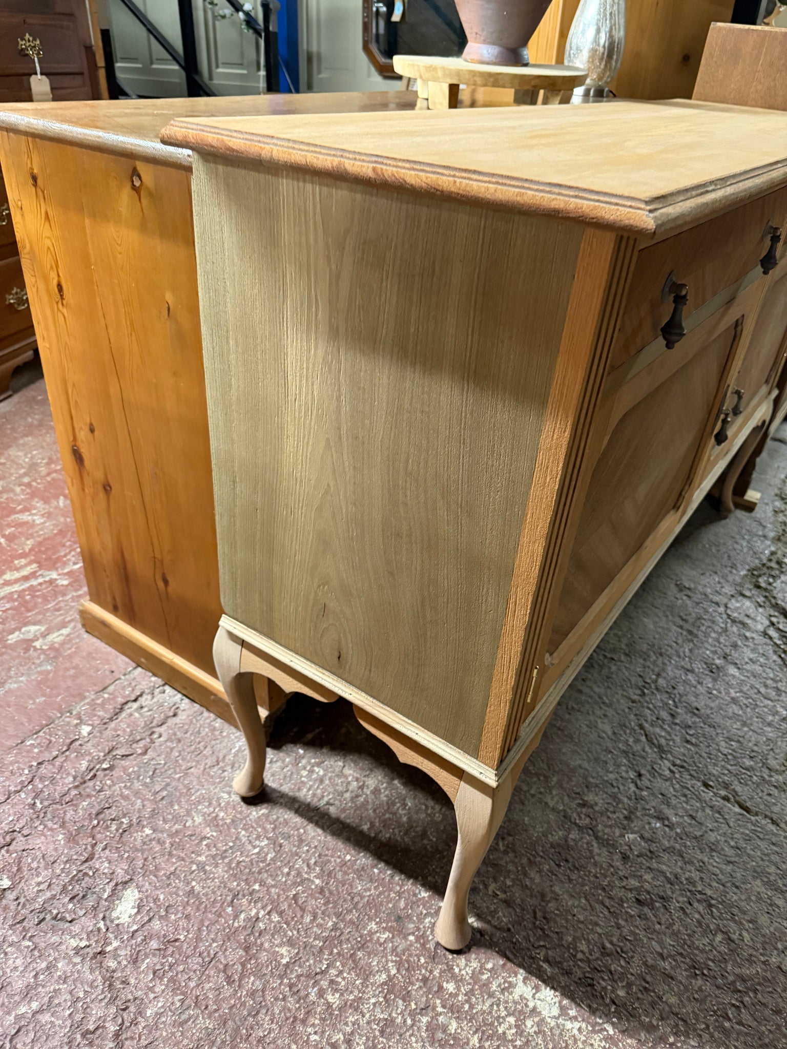 Stripped mahogany sideboard showcasing traditional joinery and solid construction. This vintage piece reveals beautiful bare wood grain after complete stripping, ready for your finishing touches. Two dovetail-jointed drawers sit above a spacious double cupboard with shelf storage—perfect for dining room essentials or display pieces. The frame remains structurally robust despite minor cosmetic marks that reflect its age. A wax finish will protect the wood and enhance its warm tones.