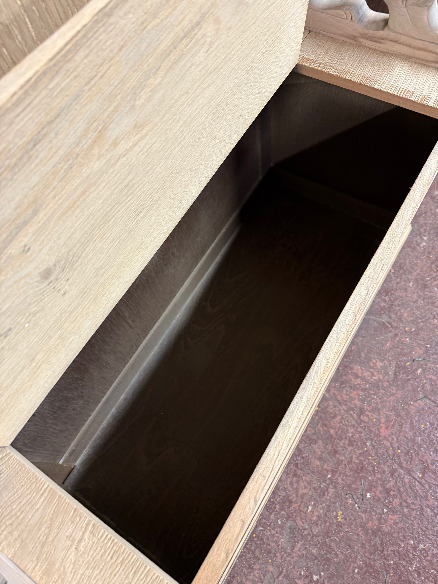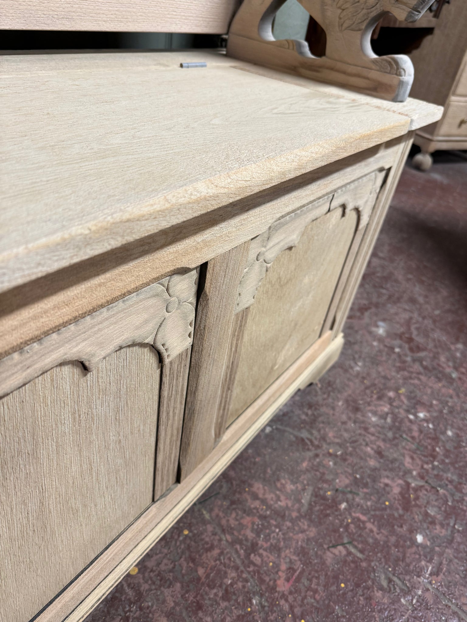 This stripped oak monks bench showcases natural wood grain with honest patina marks that add character rather than detract from it. The piece is structurally robust and ready for use as-is, though a protective wax finish would enhance durability. The hinged lid opens to reveal practical storage space, whilst the backrest folds flat for versatility. A genuine vintage find with functional appeal and room to personalise through finishing if desired.