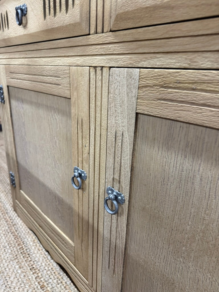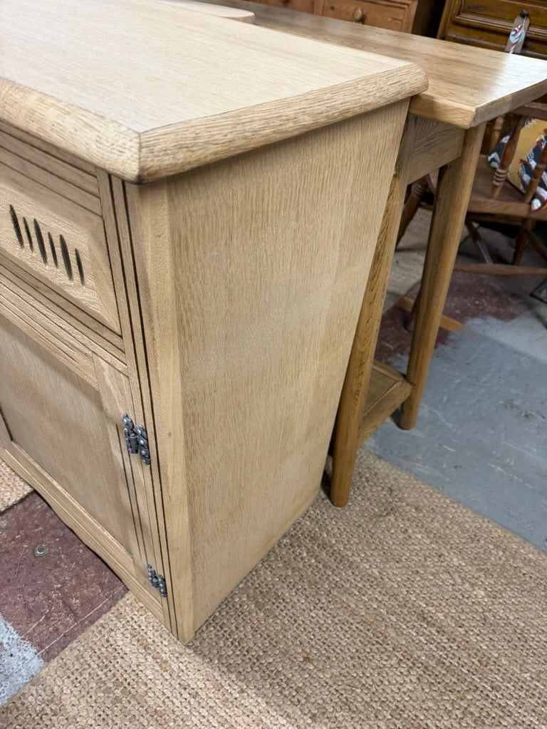 This oak sideboard has been stripped to bare wood, revealing its bare natural self. Two dovetail-jointed drawers sit above a double cupboard with a single shelf inside, providing ample storage space. The piece is in good structural condition and ready for use, though a protective wax finish is recommended to preserve the wood. A practical, characterful piece suitable for various interior styles.