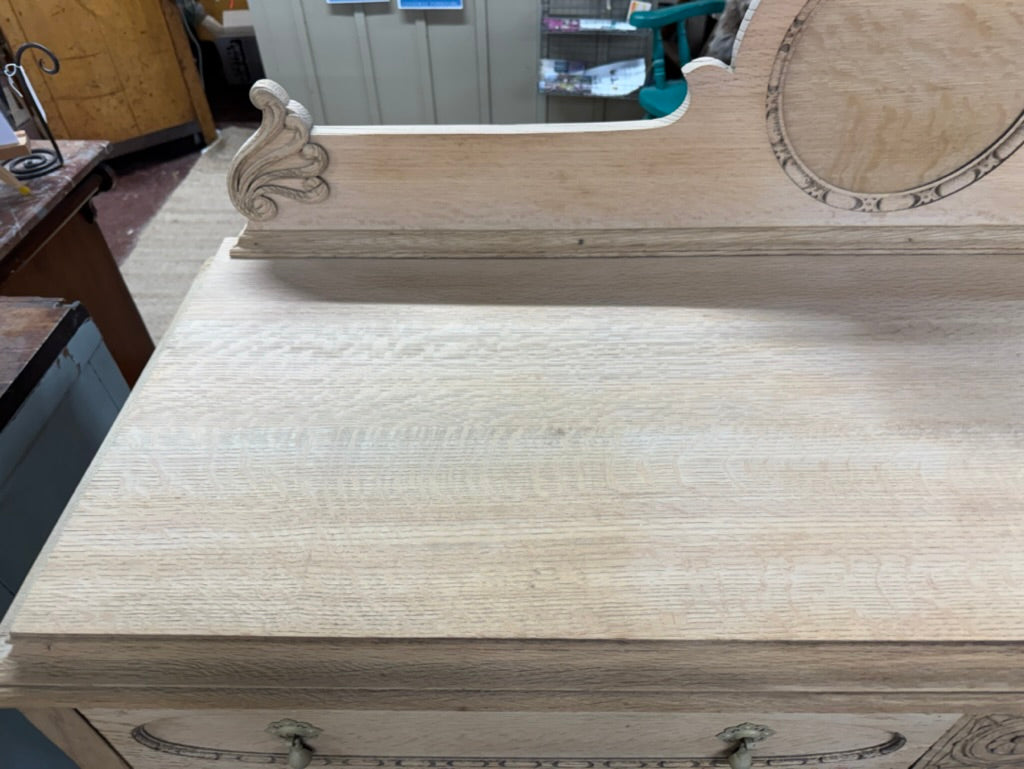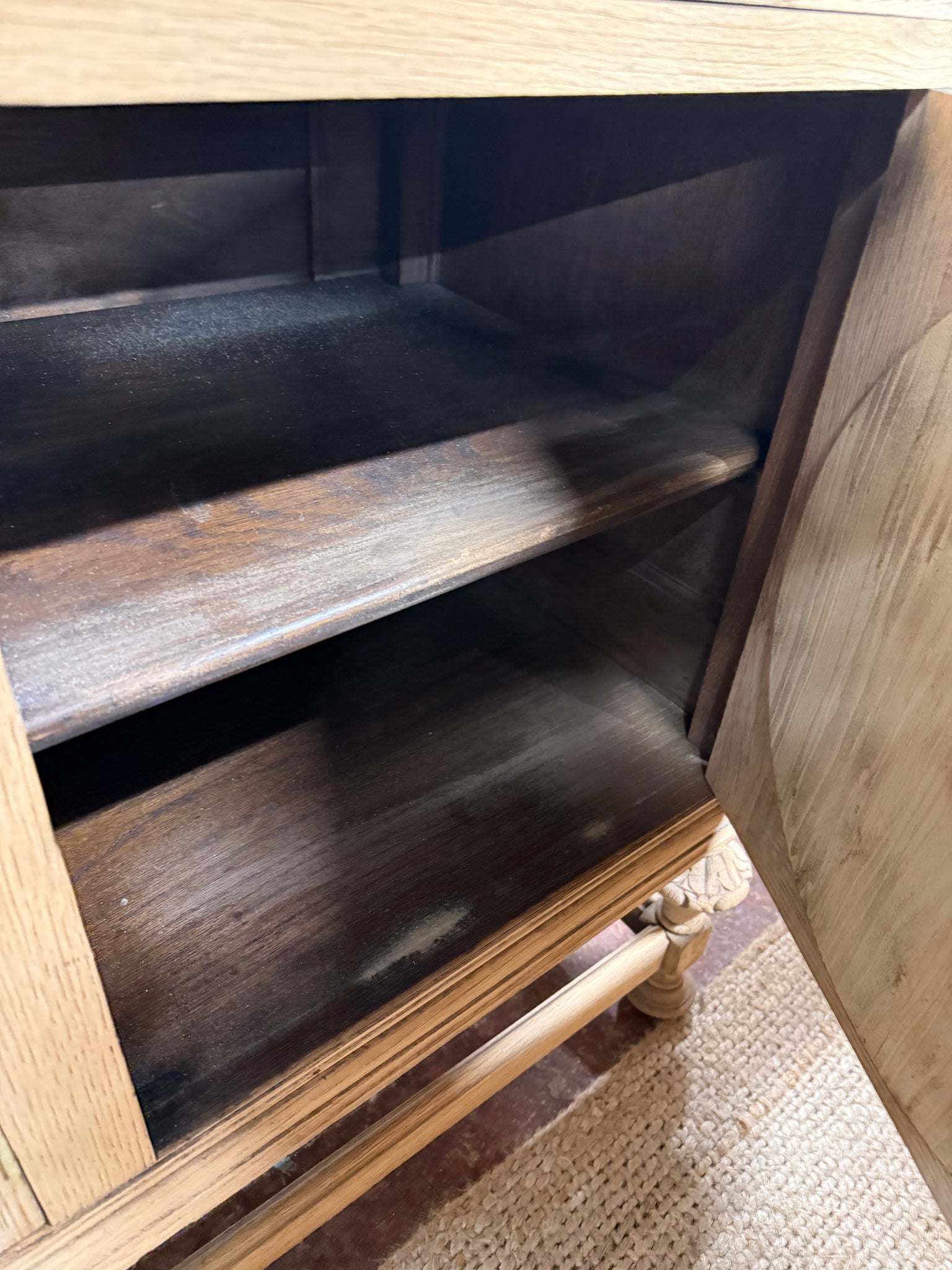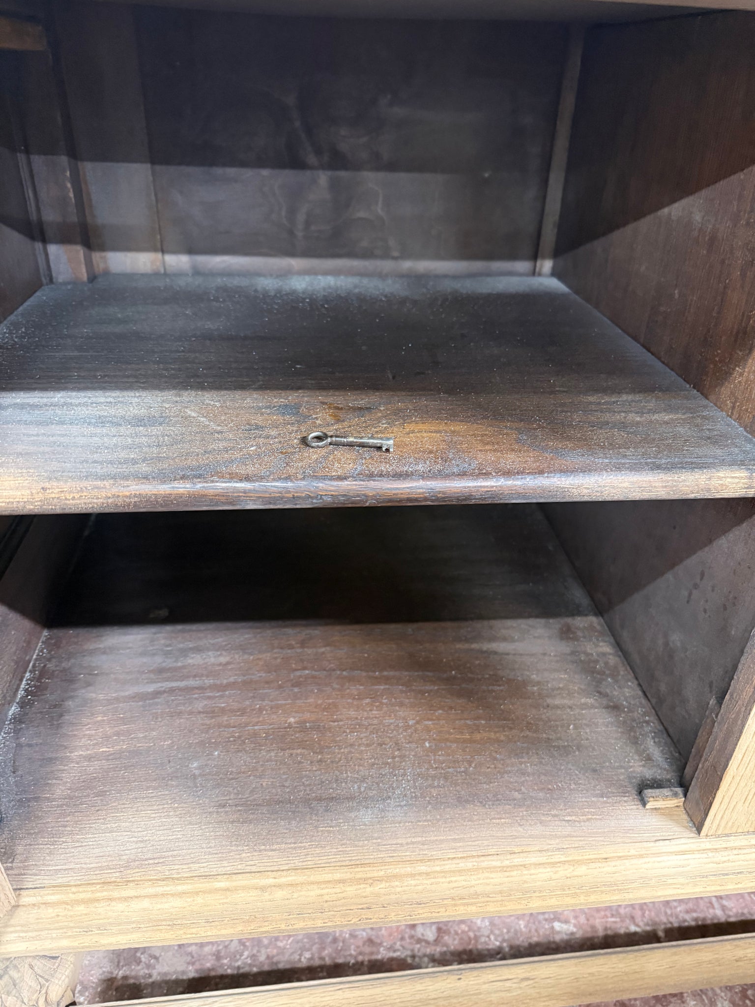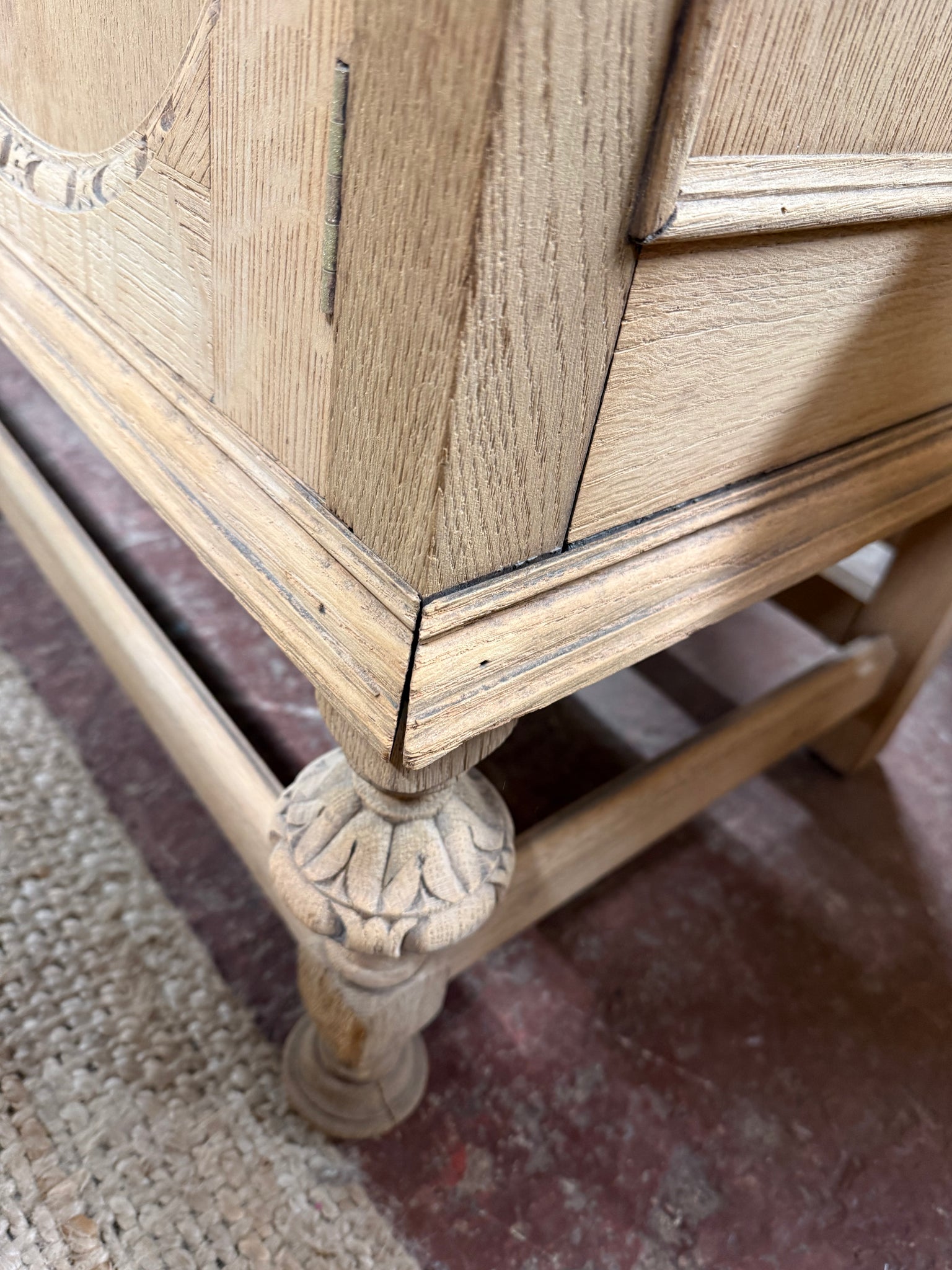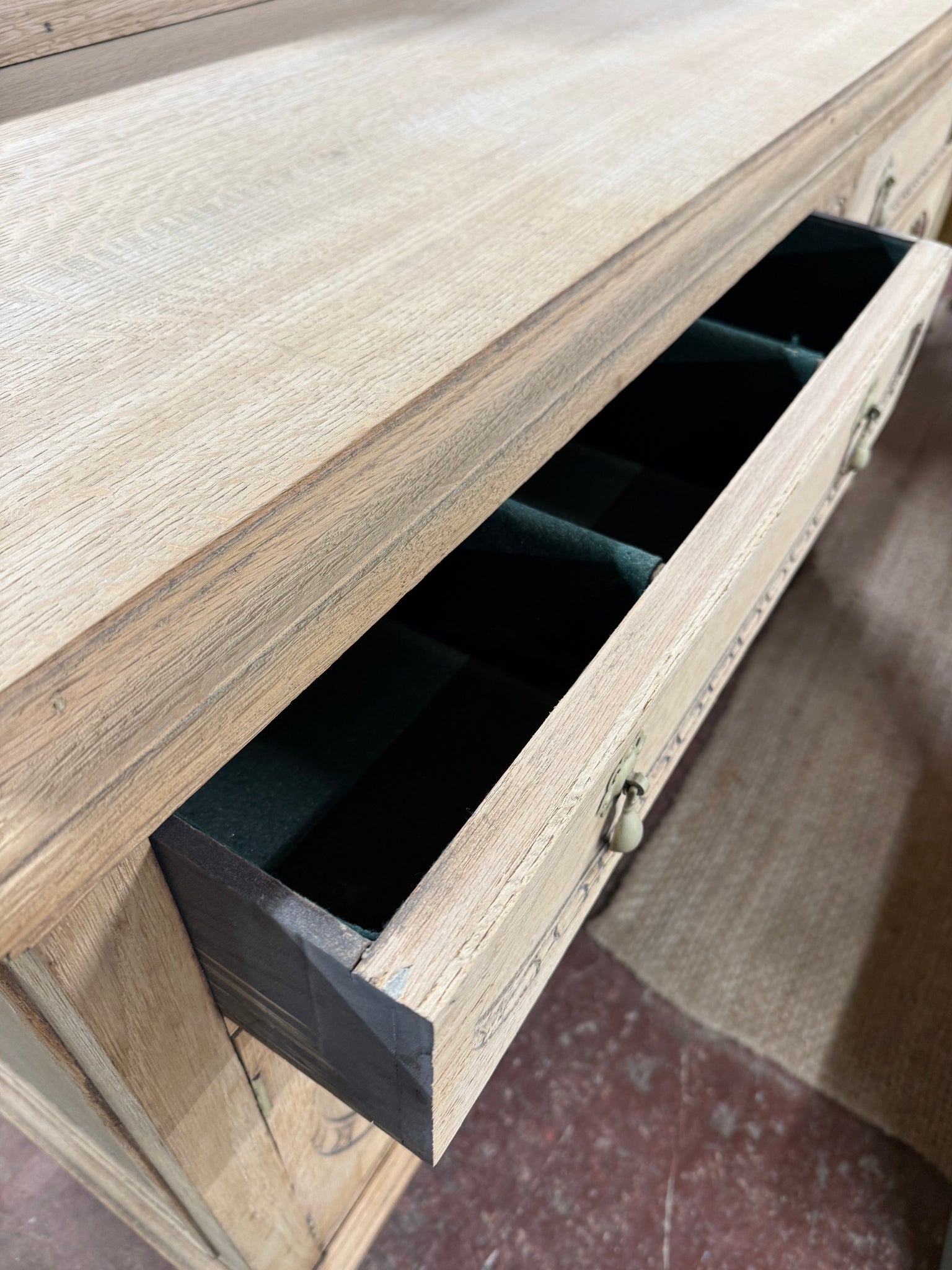 A French-style oak sideboard stripped back to reveal its natural beauty and patina. The sturdy frame houses two dovetail-jointed drawers and two cupboards, delivering practical storage with authentic period appeal. Built to last, this solid piece remains in good structural condition and comes with its original key. The bare oak would benefit from a protective wax treatment to maintain the wood and bring out its distinctive grain. Perfect for those who appreciate vintage furniture with real character and substance.