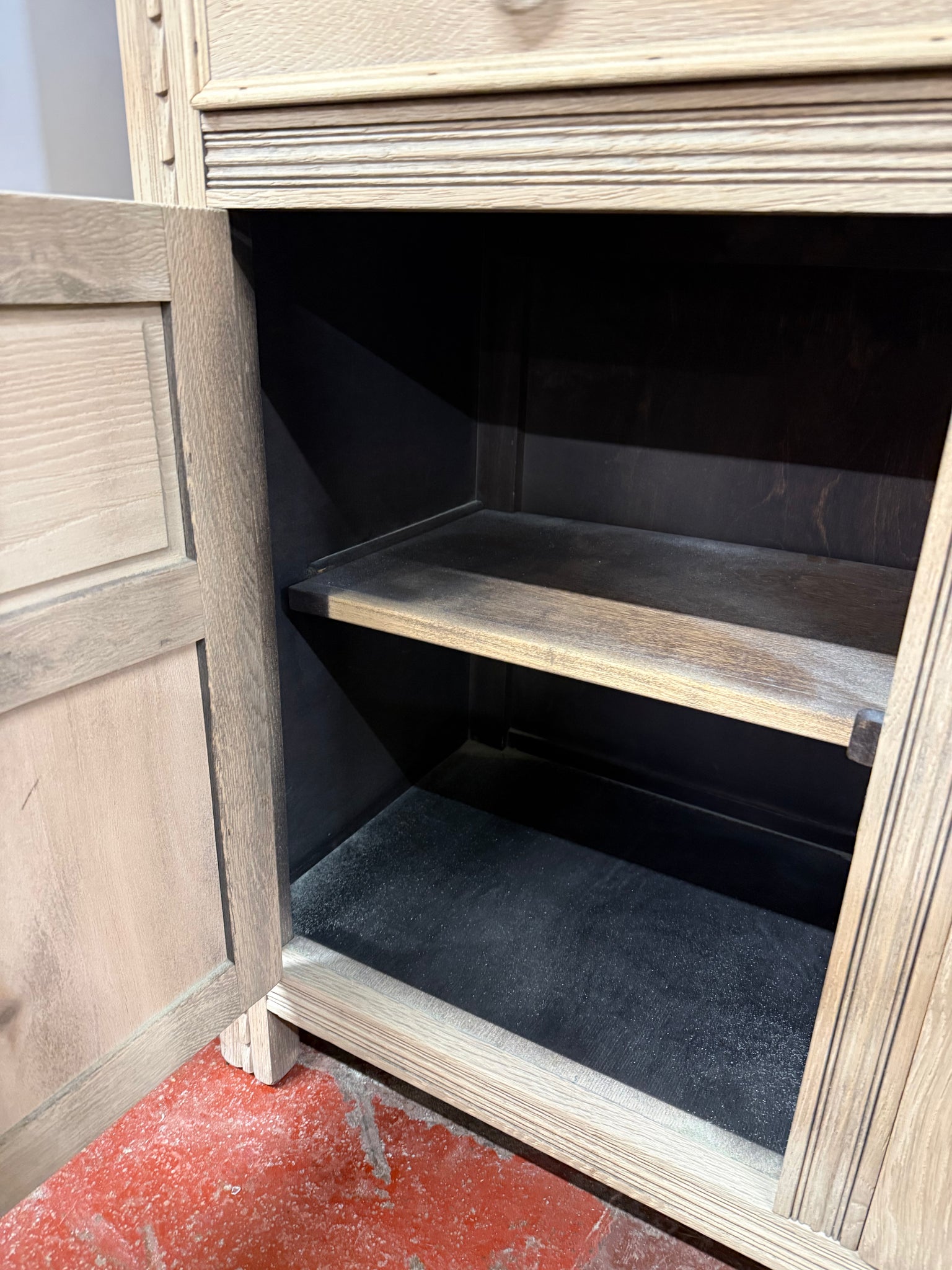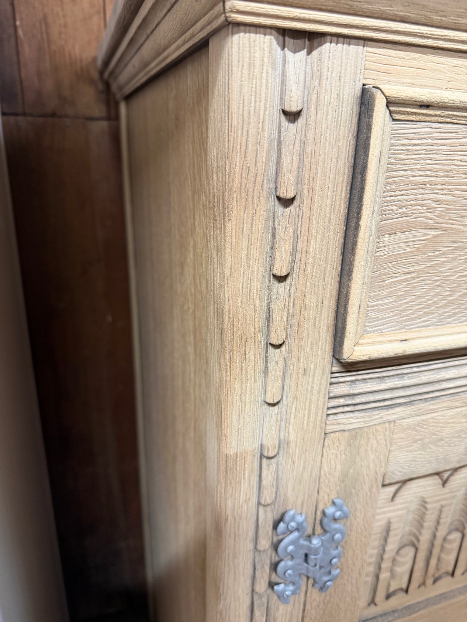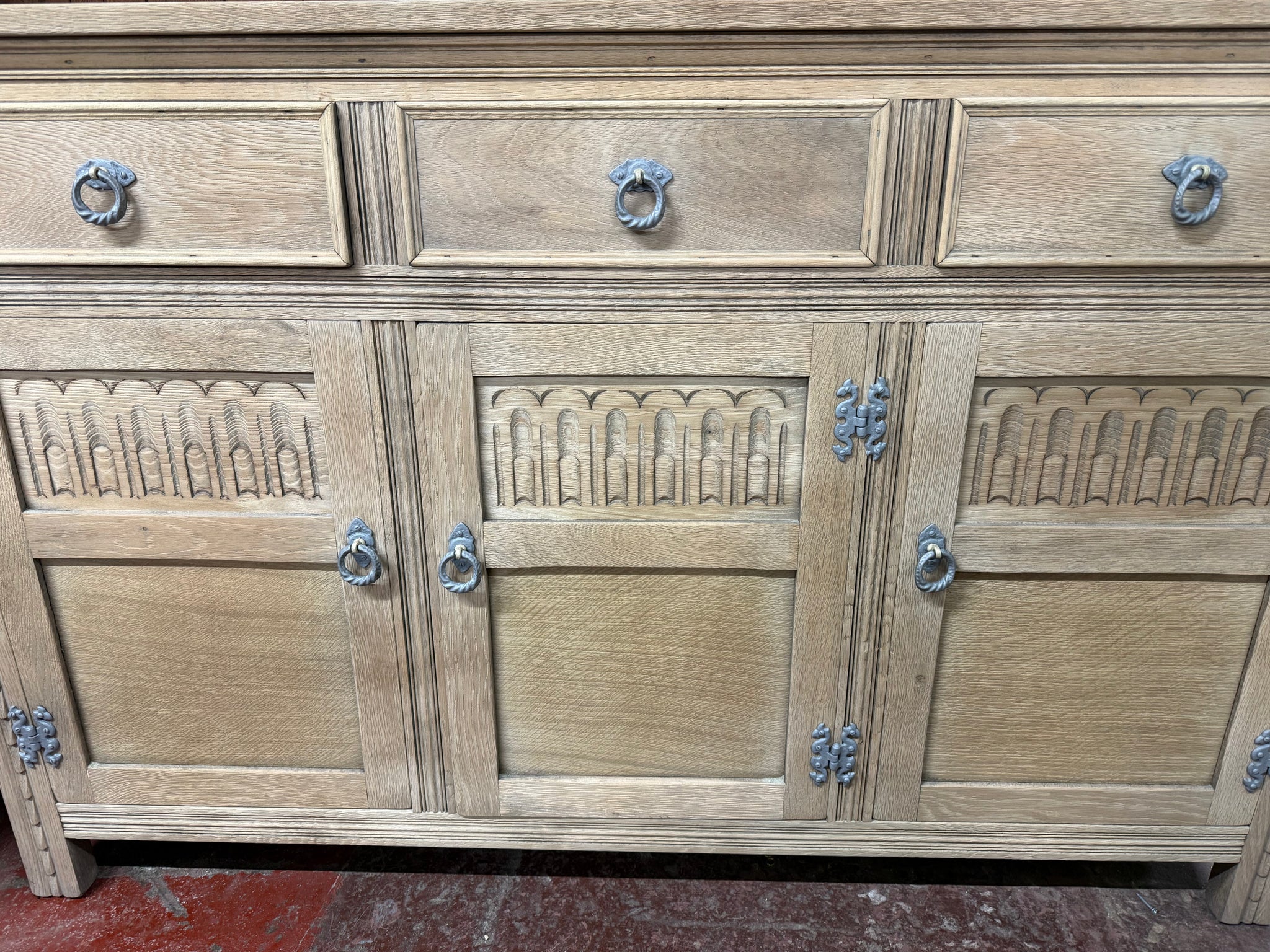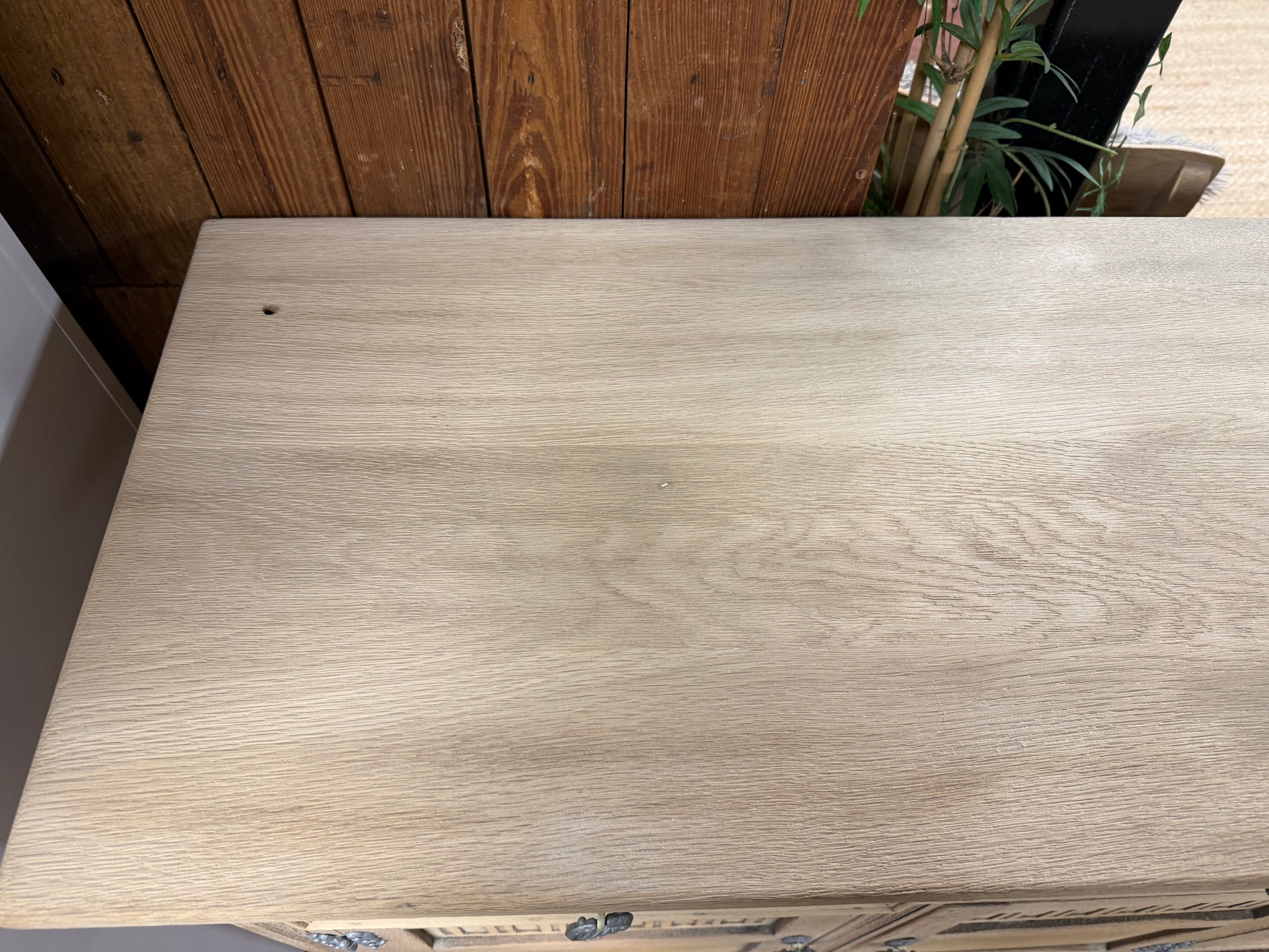 A characterful stripped oak sideboard with solid bones and honest patina. Three dovetail-jointed drawers sit above a double and single cupboard, offering practical storage. The piece is structurally sound and fully functional, though it bears the marks of age—a split is present on the top and some veneer shows wear. A protective wax finish would enhance the stripped oak and help preserve it for years to come.
