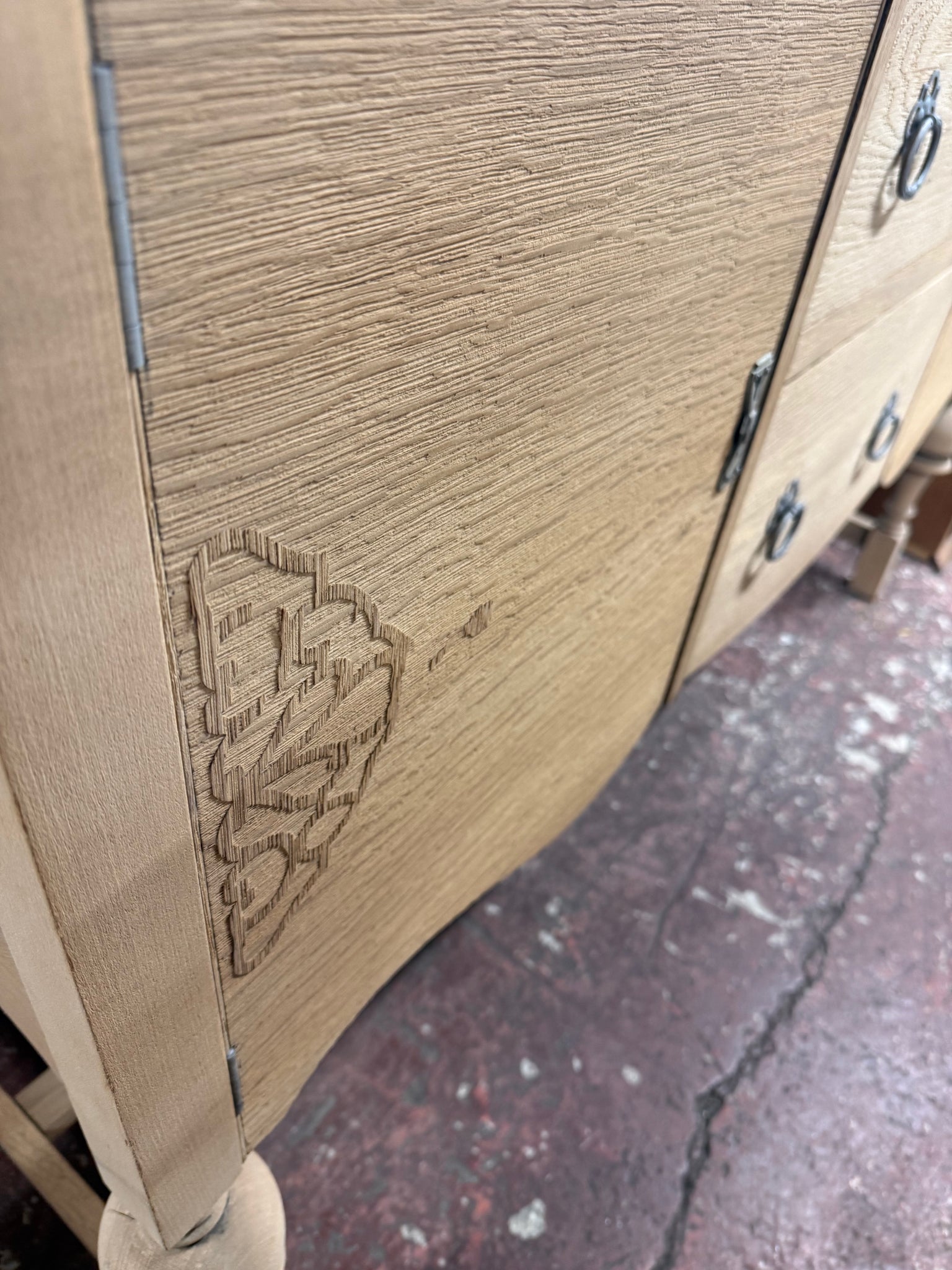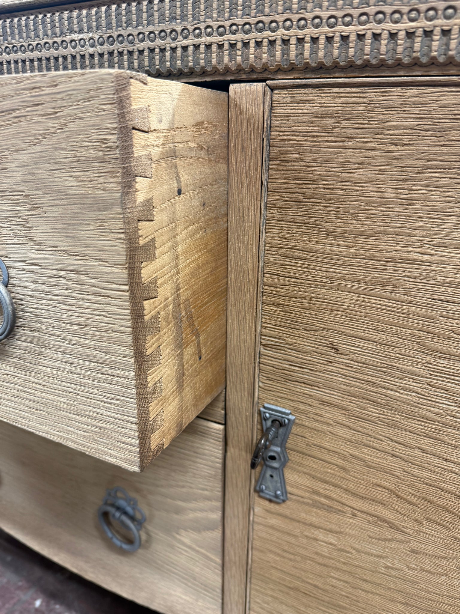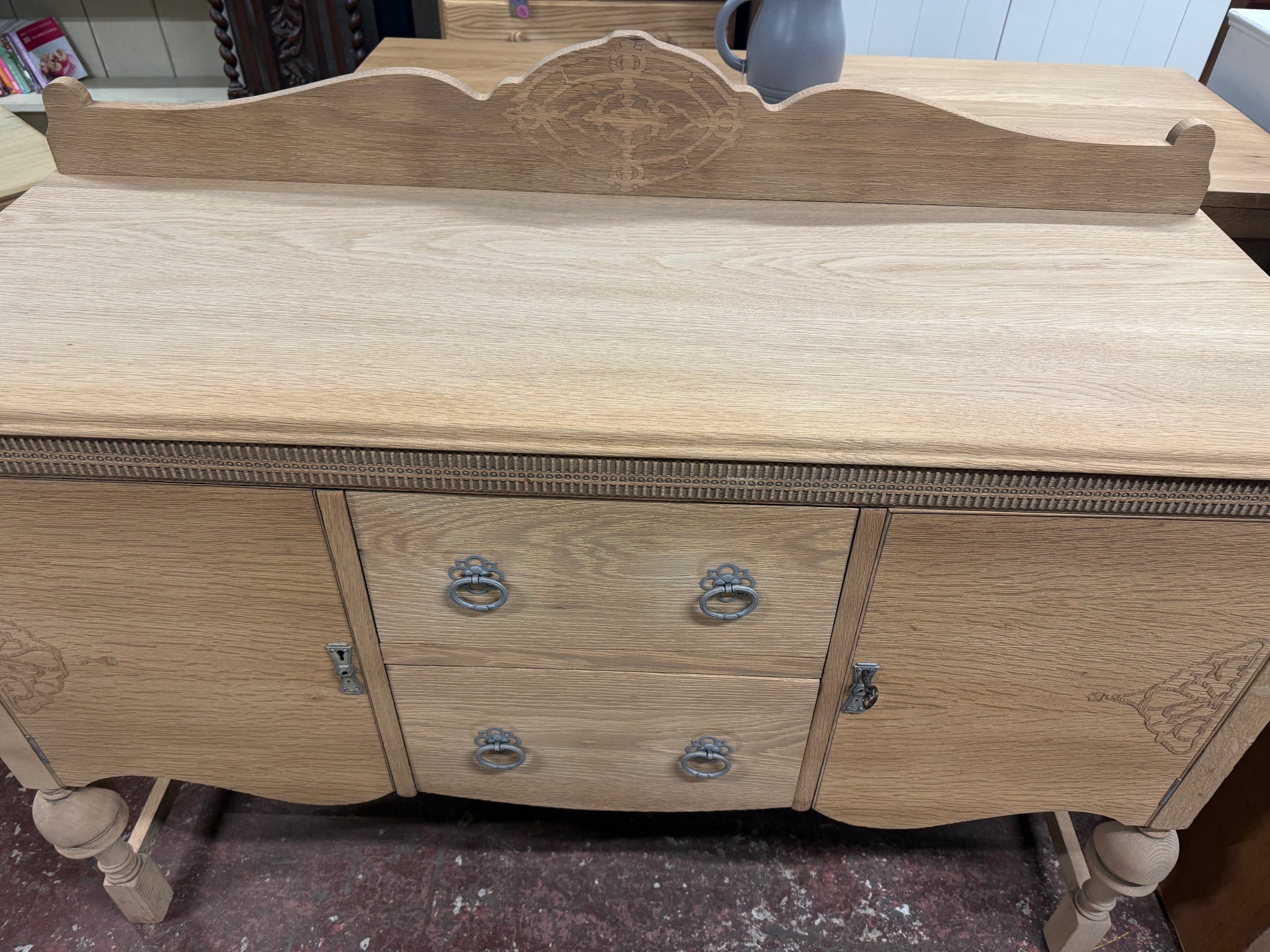 Stripped back to bare oak, this sideboard displays natural wood tones and authentic grain patterns. Two cupboards and two dovetail-jointed drawers provide ample storage capacity. The piece carries expected signs of age with minor surface marks that enhance its vintage character. Optional wax finish would offer additional protection. Supplied with key. Complements country, farmhouse, and traditional home décor schemes beautifully.