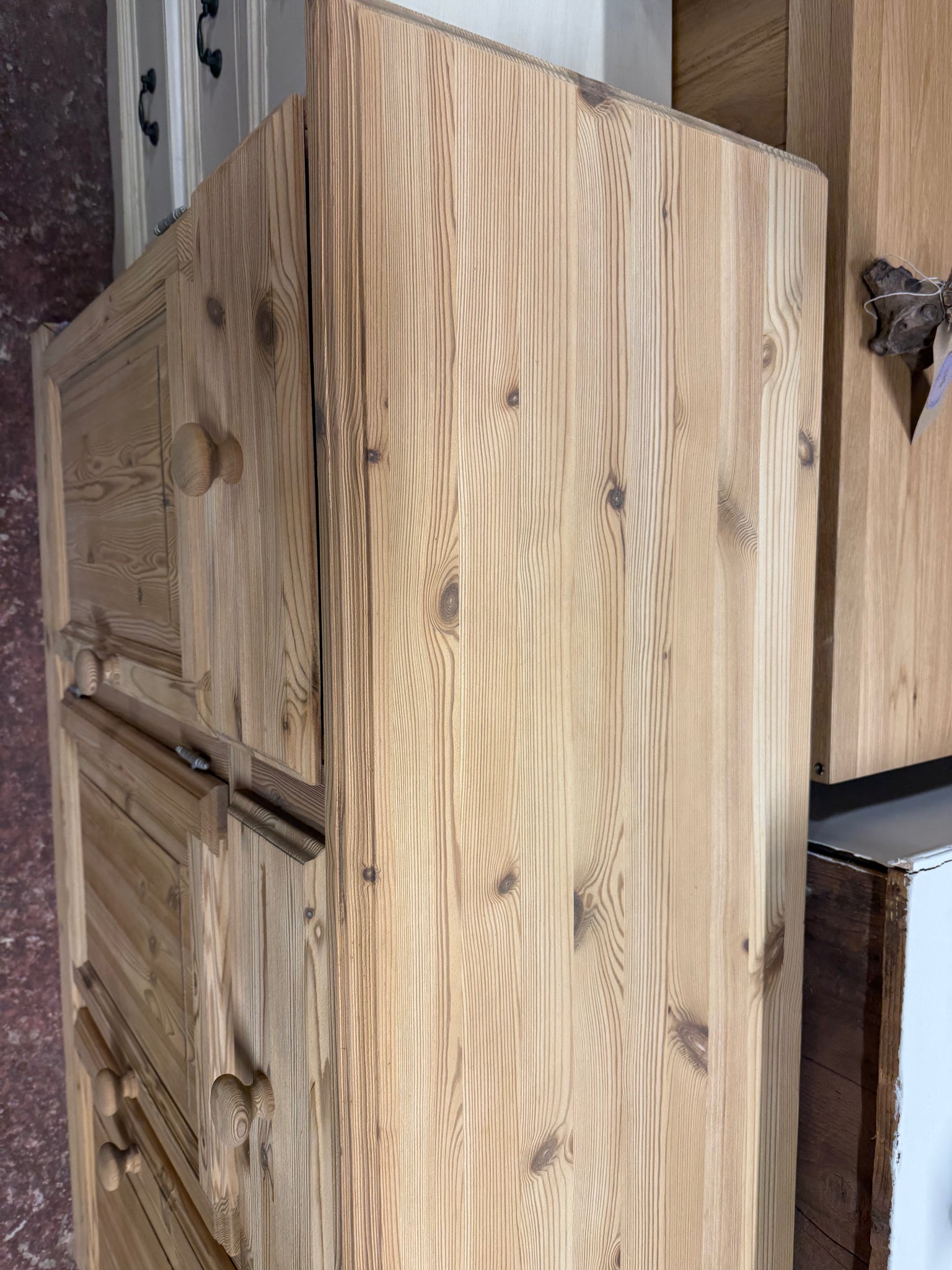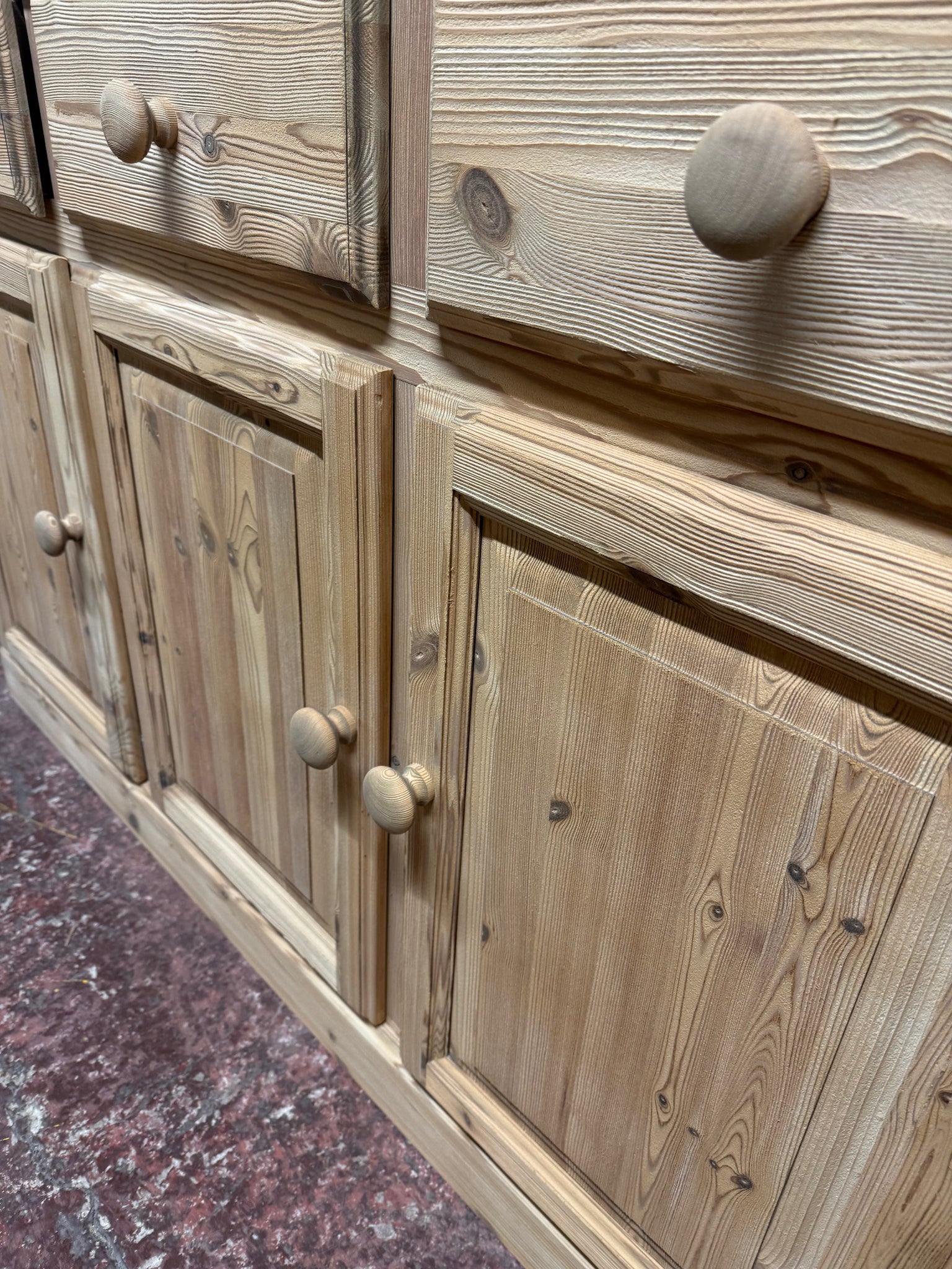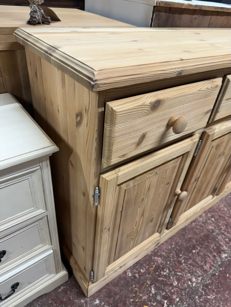 This stripped pine sideboard showcases the wood's natural character and grain. Featuring three short drawers positioned above a double cupboard and single cupboard, it offers versatile storage for dining rooms or living spaces. The piece is structurally sound and in good condition. To enhance protection and bring out the wood's warmth, consider applying a quality wax finish.