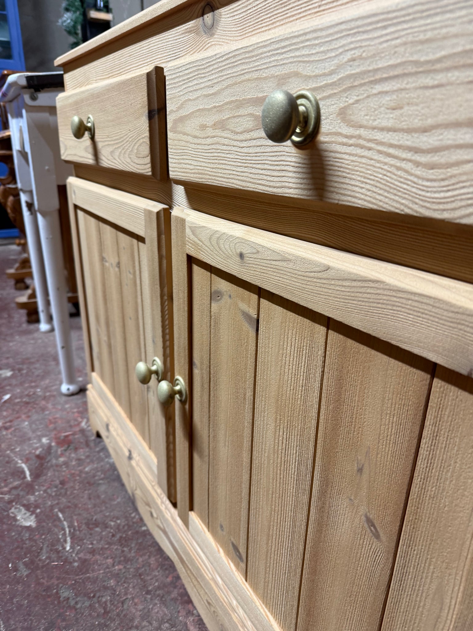 This solid pine sideboard has been stripped back to bare wood, revealing its natural grain and character. In excellent structural condition, it's ready for finishing with your choice of wax or stain. The practical layout features two drawers above a spacious double cupboard with internal shelving, offering plenty of room for tableware, linens, or household items. A versatile piece that brings warmth and storage to any dining space.
