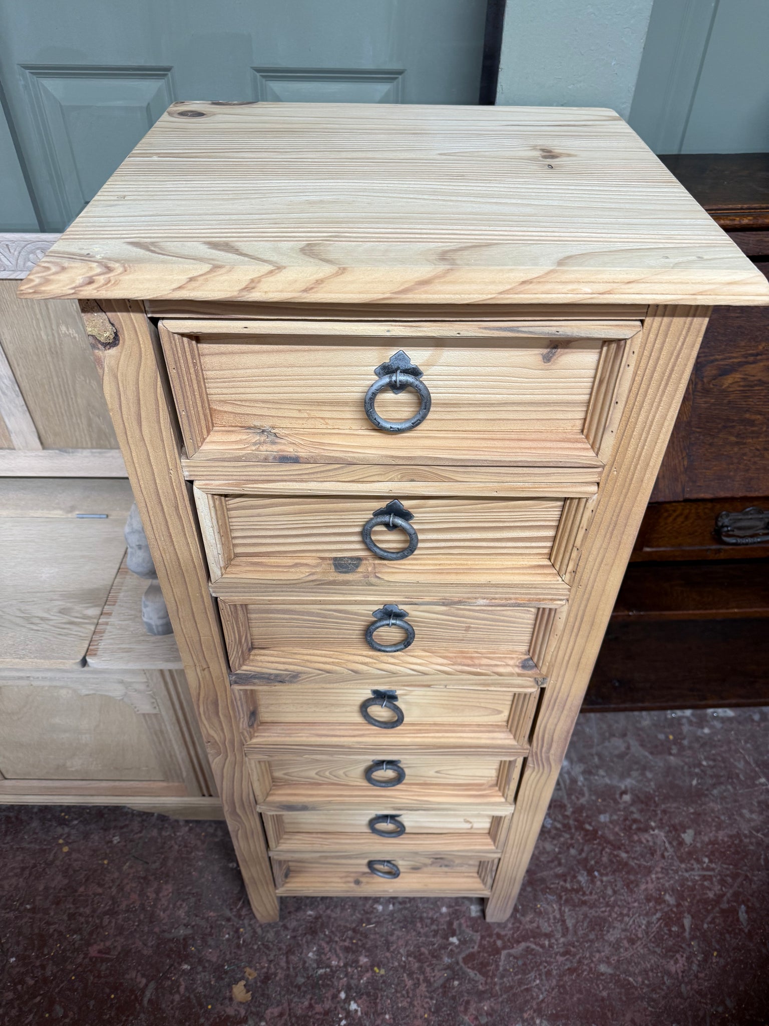 This seven-drawer tallboy is crafted from solid pine with traditional dovetail joinery for durability. Its slender profile makes it ideal for tight corners and compact rooms. The stripped finish reveals the natural wood grain, though you may want to apply wax or oil to protect the surface and enhance its appearance over time.