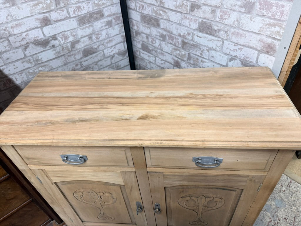 This satinwood sideboard showcases its natural finish after being stripped back to bare wood. Two dovetail-jointed drawers sit above a double cupboard with a single shelf inside, providing ample storage space. The furniture is in solid working condition with only light marks on the surface. A protective wax application will enhance and preserve the wood.