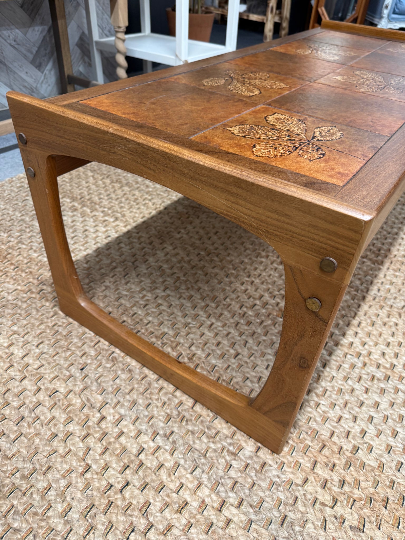 This beautiful coffee table features a sturdy teak frame with a stylish tile top. It’s in great overall shape with only a few small marks, showing its gentle use. A wonderful choice to brighten up any living room space!