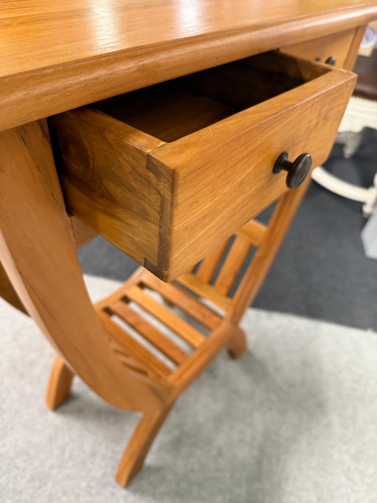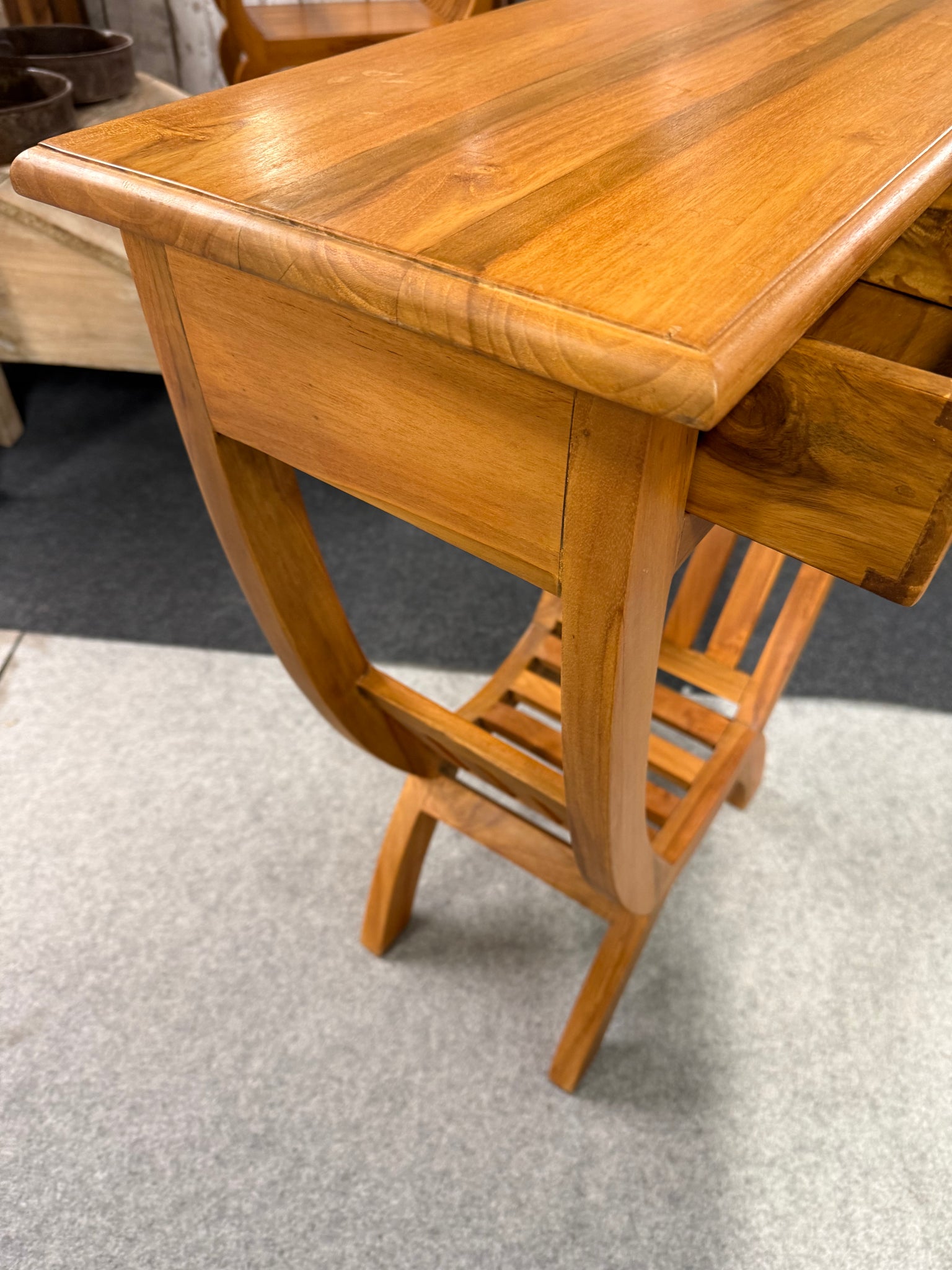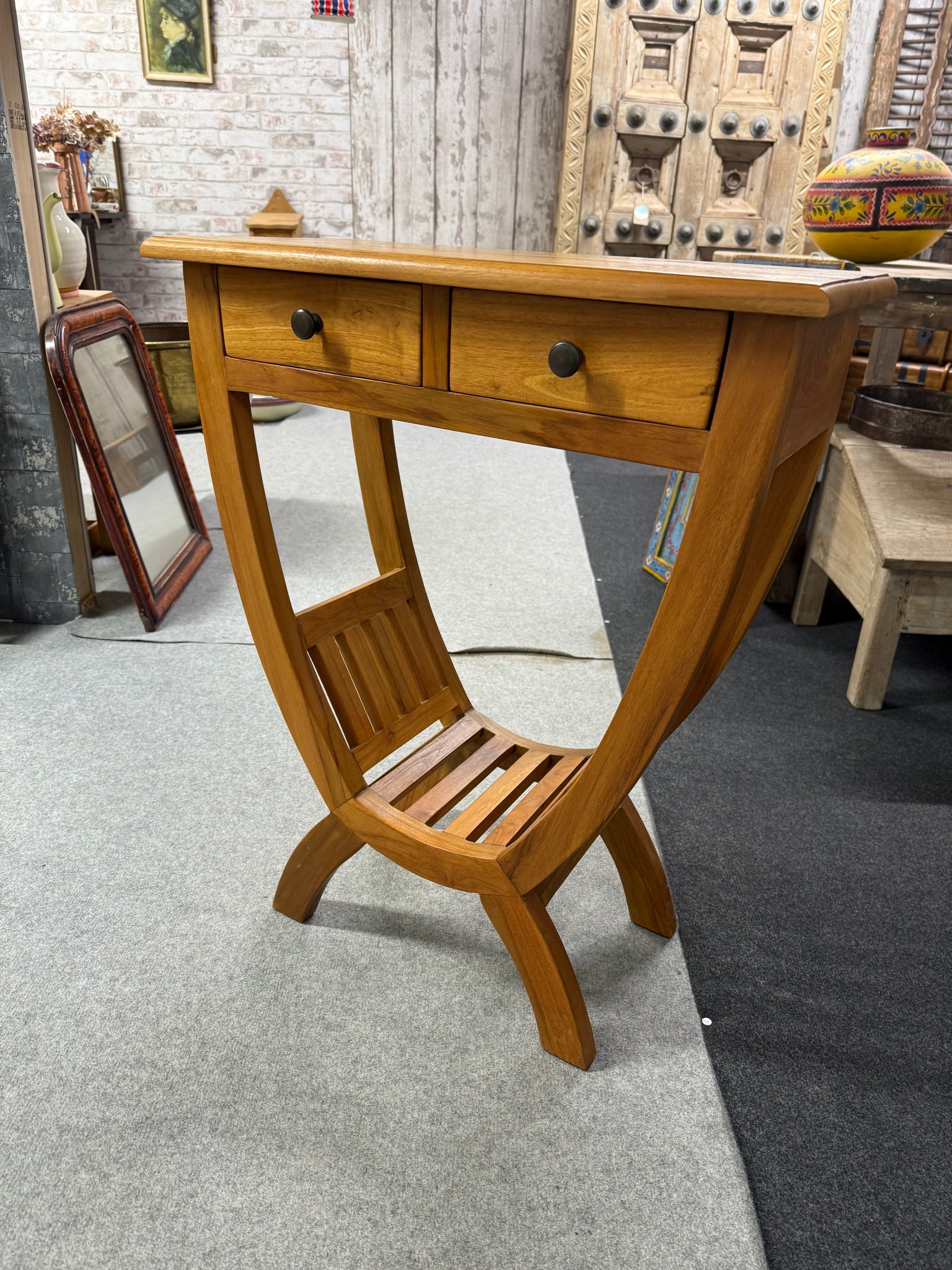 Solid Indonesian teak kartini console table built to withstand daily use. The frame is structurally robust with authentic dovetail-jointed drawers and a convenient lower shelf for storing essentials. Surface wear and minor marks reflect its history, but nothing compromises functionality or appeal. A reliable, well-made piece with genuine character.
