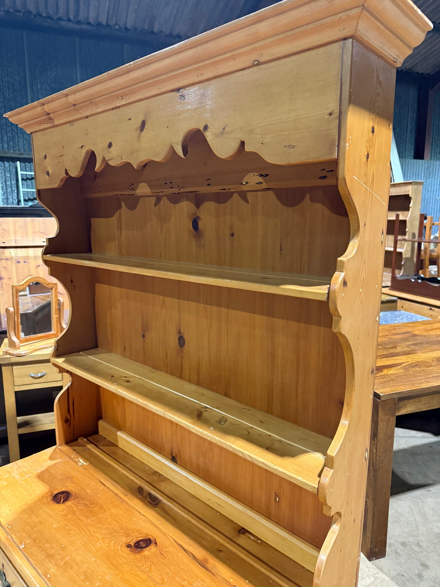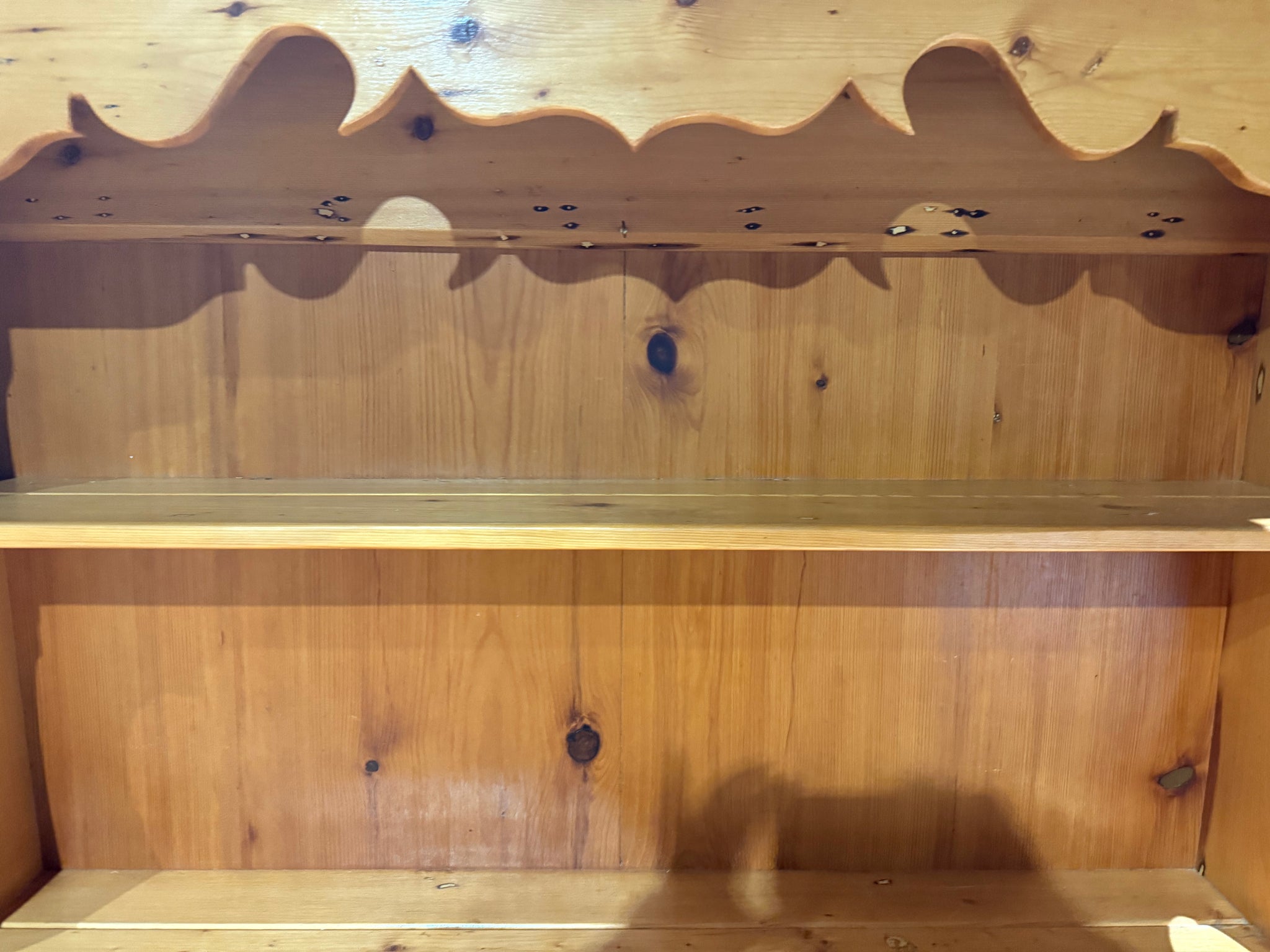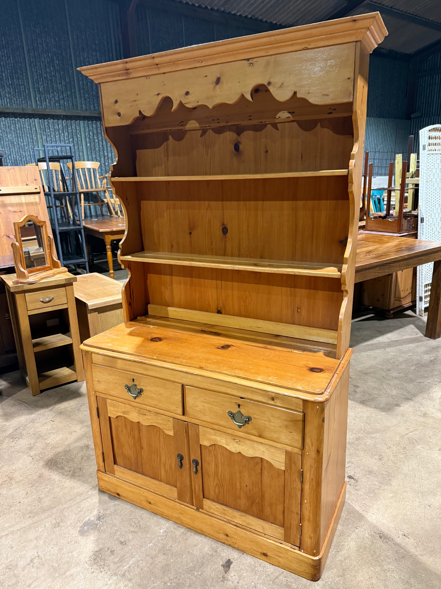 A characterful vintage pine dresser that combines practicality with period charm. Structurally solid and well-maintained, this piece showcases the natural patina of age with only minor surface marks. The design maximises storage across multiple sections: shelving in the upper portion, two dovetail-jointed drawers for secure storage, and a lower double cupboard. Thoughtfully constructed in two parts for convenient transport and placement. Ideal for those seeking authentic vintage furniture with genuine character and everyday functionality.