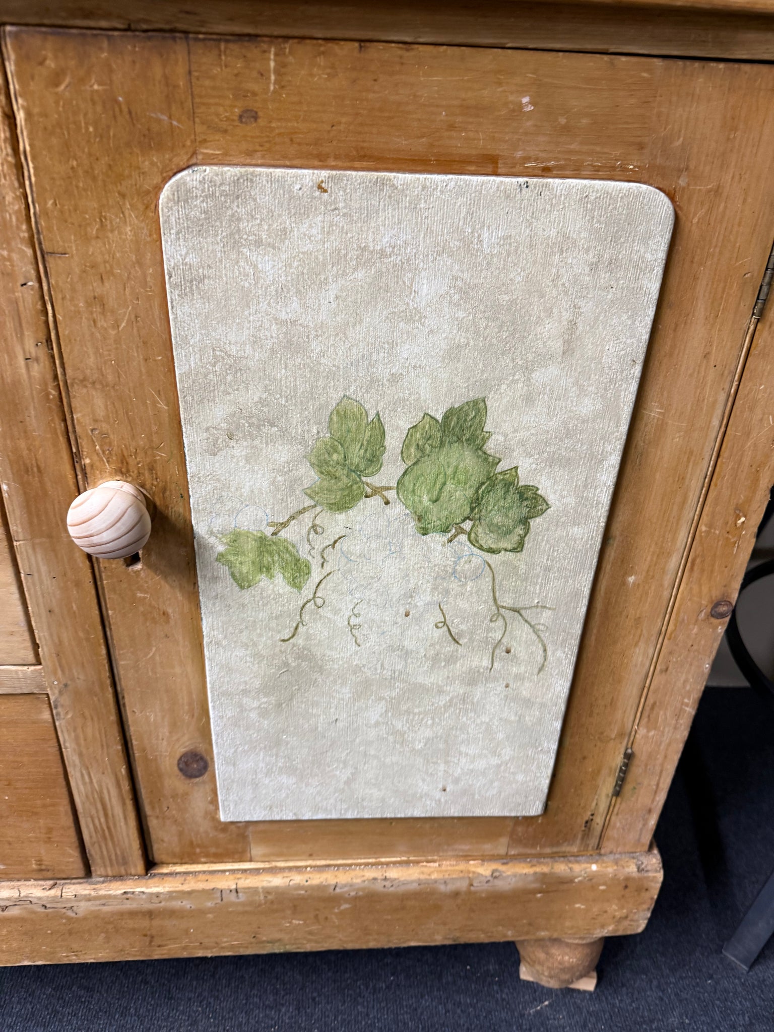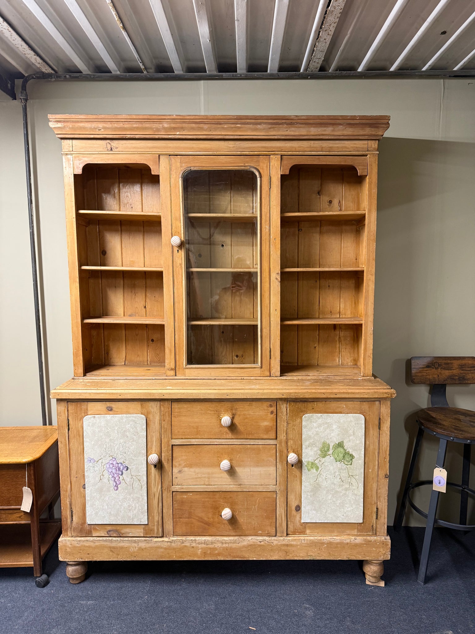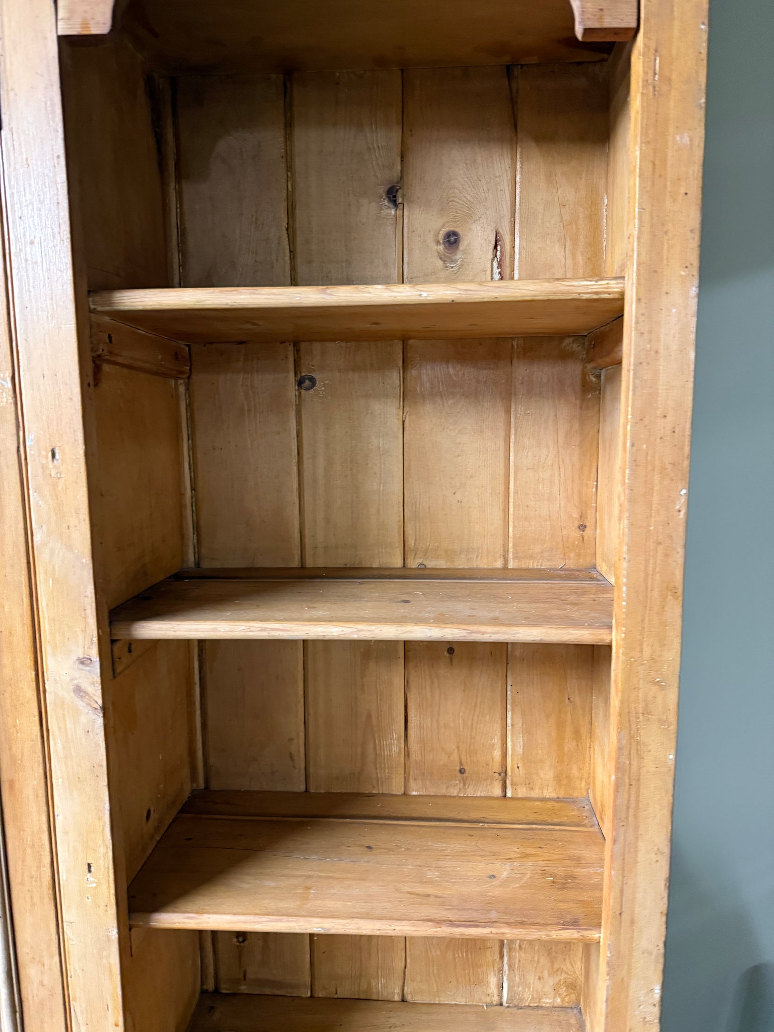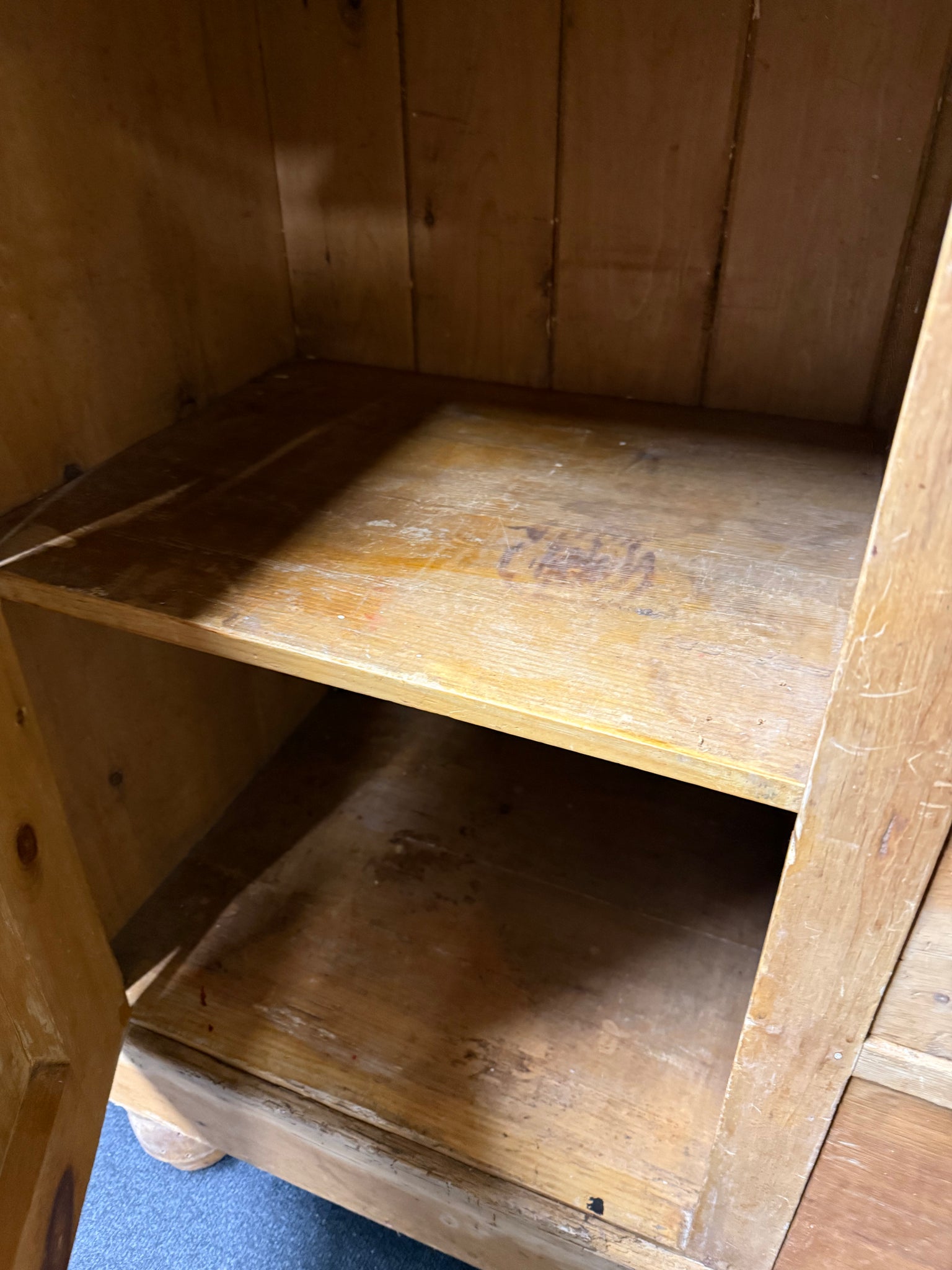 A characterful vintage pine Welsh dresser with genuine patina reflecting its age. Structurally solid and fully functional, this piece shows honest wear through surface marks that add to its authentic charm. The practical design features three shelves above two single cupboards, plus three dovetail-jointed drawers —ideal for substantial storage needs. Thoughtfully designed to separate into two sections for convenient transport and placement.