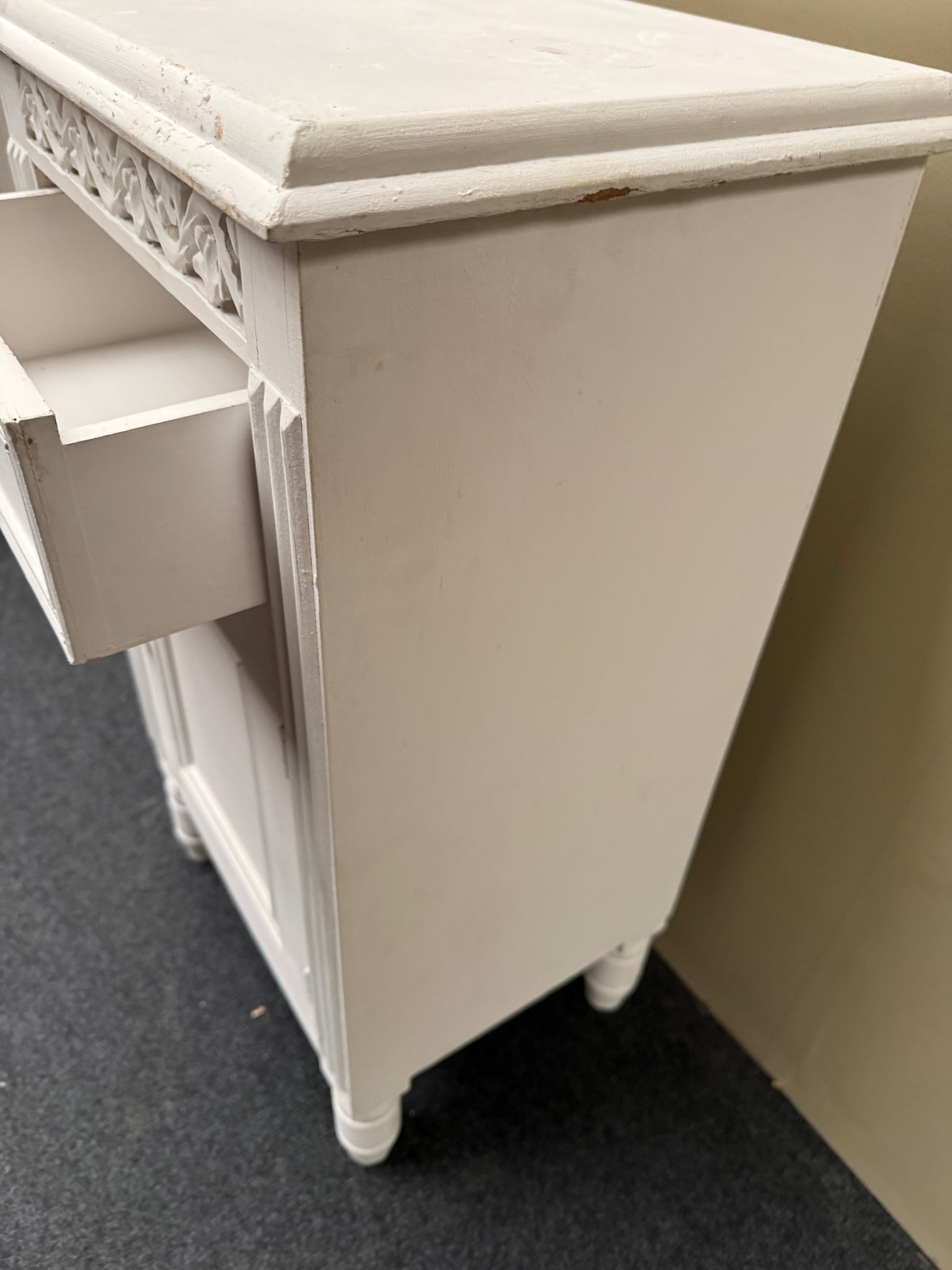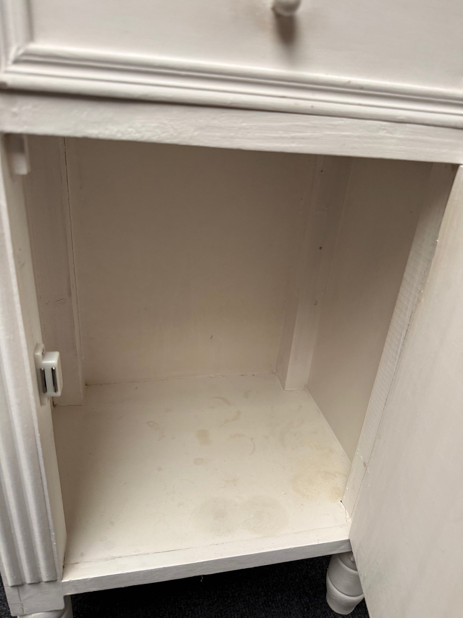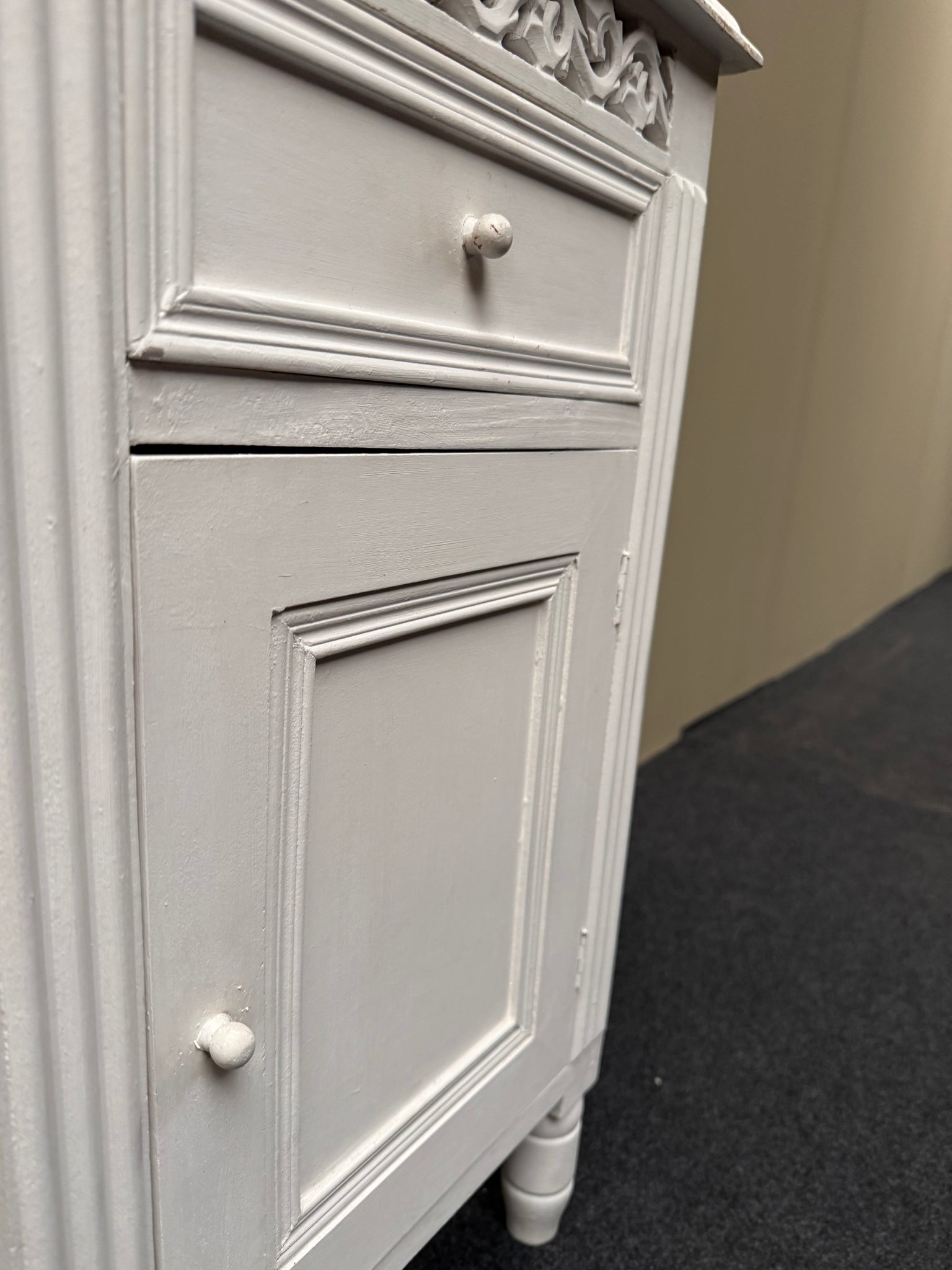 A charming vintage pot cupboard with solid construction and reliable storage. This pre-loved piece features a single drawer and enclosed cupboard, offering practical space for your kitchen essentials. While it shows its age with visible wear, the sturdy frame is ready for a fresh coat of paint to restore it to its former glory.