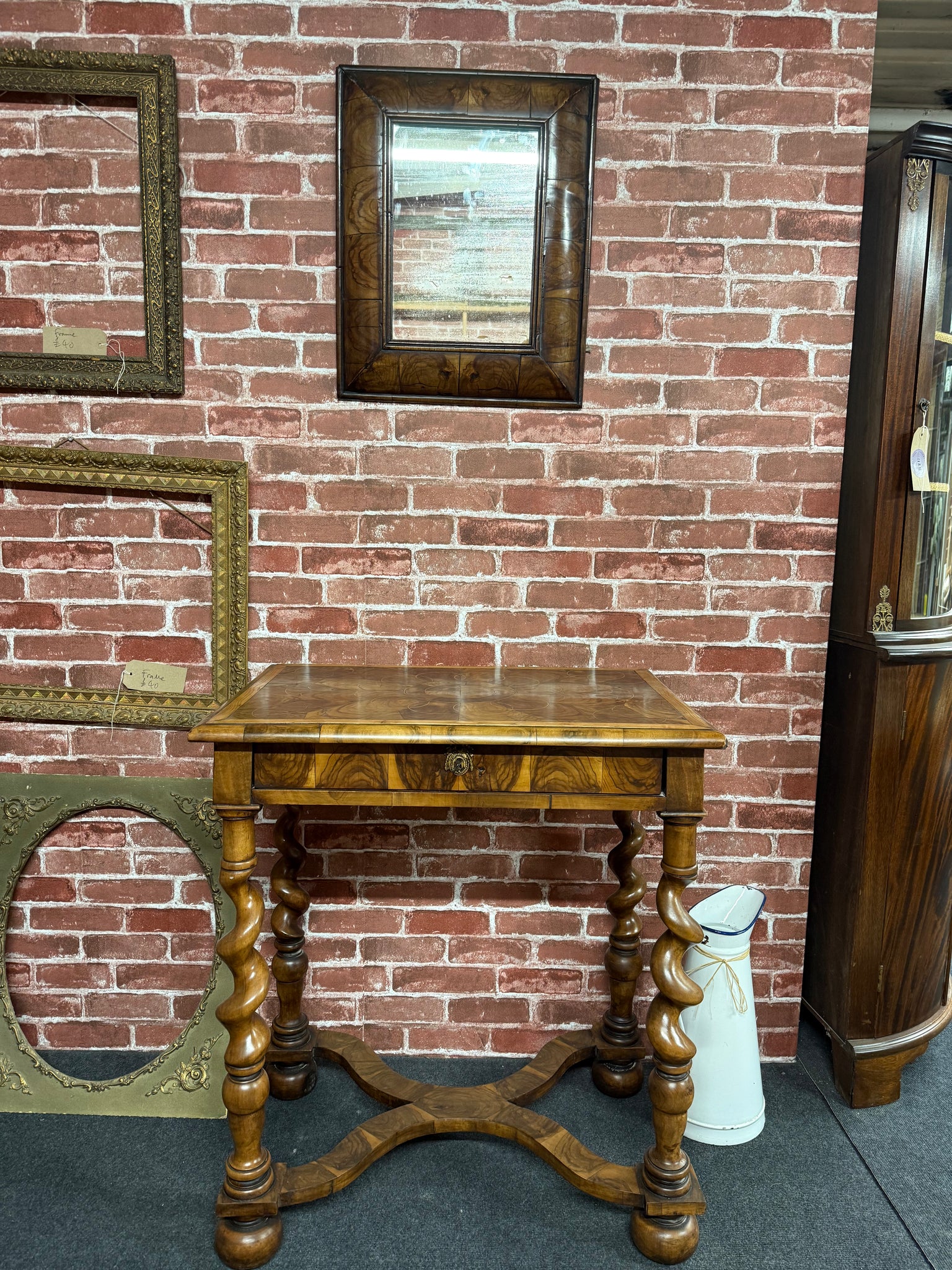 This elegant William & Mary reproduction set combines timeless design with practical functionality. The table showcases distinctive barley twist legs and includes a dovetail-jointed drawer for convenient storage, while the matching mirror features authentic natural patina. Both pieces are structurally sound and in excellent condition, making them ideal for creating a sophisticated home office or welcoming entryway display.