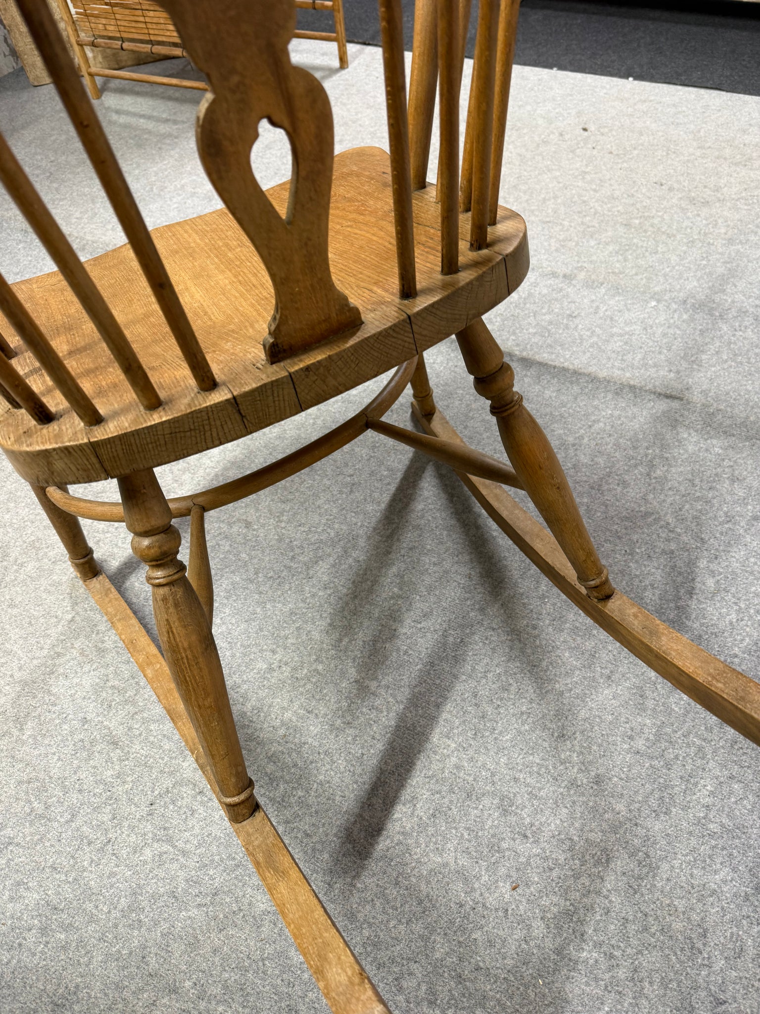 A charming Windsor-style rocker crafted from elm and beech, this piece combines classic design with authentic character. While showing its years through natural wear and patina, the chair remains structurally solid and fully functional. Minor age-related marks are visible—refer to photos for details—but nothing detracts from its appeal. Ideal for adding warmth to a living room, bedroom, or cosy reading corner, this vintage find brings timeless elegance to any space.