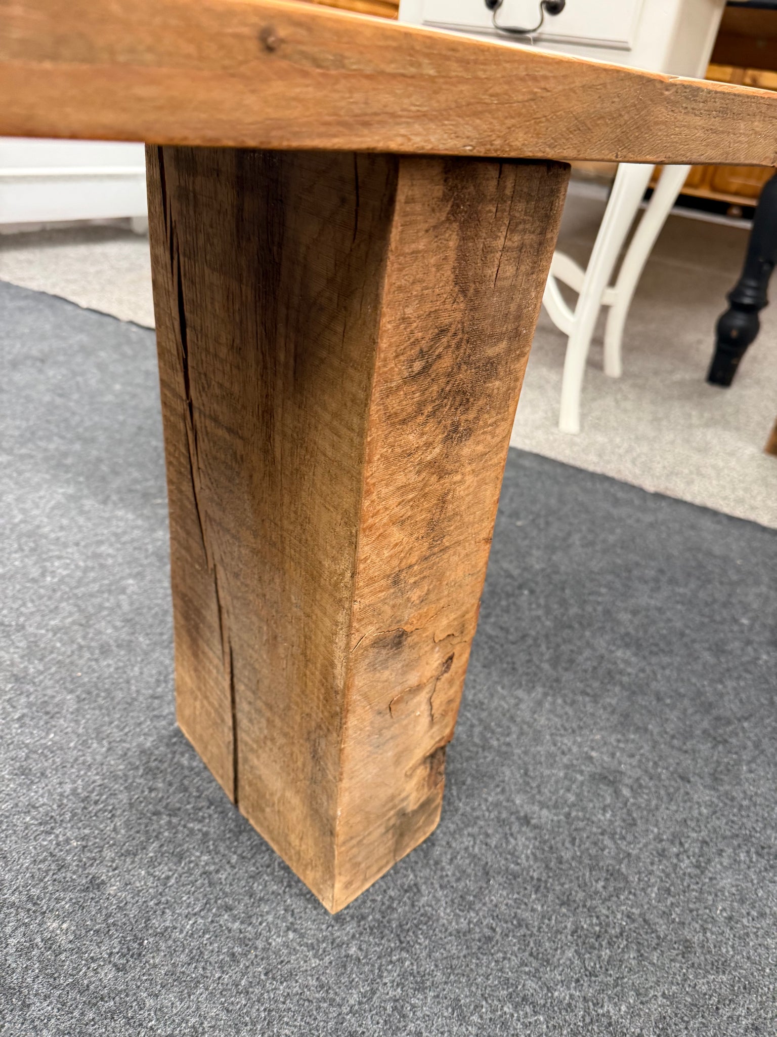 A charming solid wood dining bench with authentic rustic character, perfect for country-style interiors. This pre-loved piece shows honest signs of age and use, including surface marks that add to its vintage appeal. Structurally sound and ready to enhance your dining space with natural warmth and traditional craftsmanship.